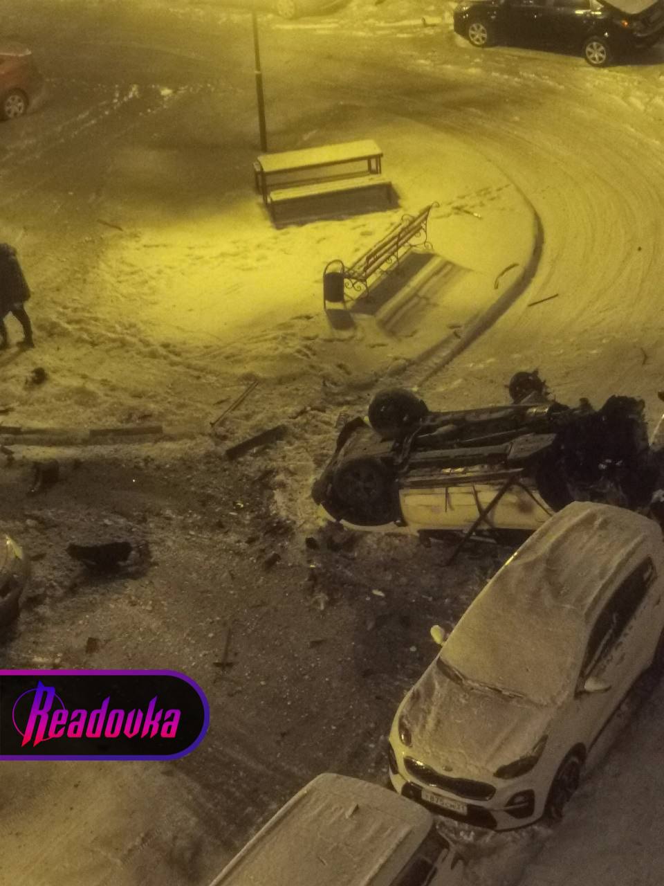 Местные делятся последствиями ударов ВСУ. Одну машину перевернуло на крышу, а другая получила множественные повреждения.