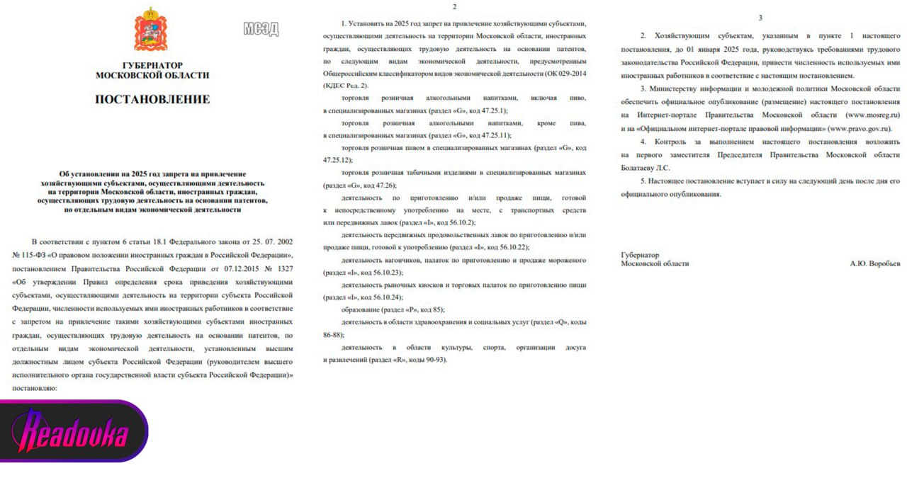 В Московской области с 1 января 2025 года введут ограничения на работу мигрантов в сфере торговли Согласно постановлению Правительства Подмосковья, ограничения на работу мигрантов введут с 1 января 2025 года в сферах: торговли алкоголем и табаком, уличного питания, социальных услуг, а также спорта, культуры, досуга, здравоохранения и образования. Ограничения на работу иностранных граждан в регионе вводятся в целях обеспечения национальной безопасности, «минимизации потенциальных конфликтов» и приоритетного трудоустройства российских граждан. «За три года у нас существенно выросли жалобы в торговле, связанные с иностранной рабочей силой. Мы хотели бы присоединиться к 22 регионам, которые ввели в них полный запрет на работу по патентам», — заявили в пресс-службе зампреда правительства Подмосковья. Тенденция на ограничение работы иностранных специалистов в России все больше развивается — подобные меры уже были введены в ряде регионов нашей страны. Недавно инициатива на введение перечня запретных профессий для мигрантов появилась в Алтайском крае.