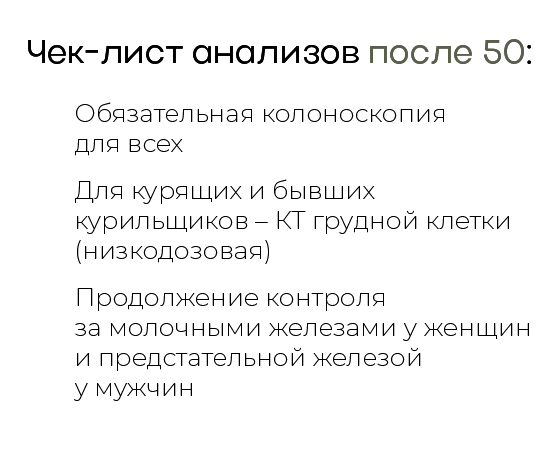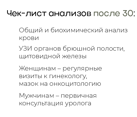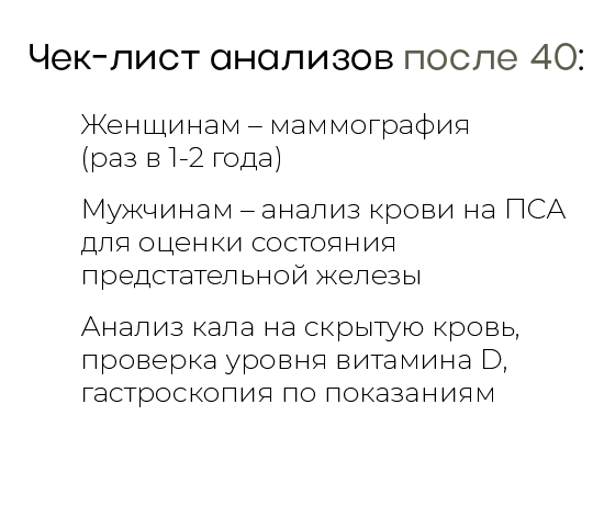 Если у тебя есть наследственная предрасположенность к онкологическим, эндокринным или сердечно-сосудистым заболеваниям, обсуди с врачом более расширенный план диагностики. Возможно, понадобятся генетические тесты, углубленные гормональные панели или МРТ/КТ органов.