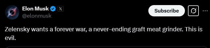 "Зеленский хочет вечной войны, бесконечной мясорубки взяточничества. Это зло." — Илон Маск