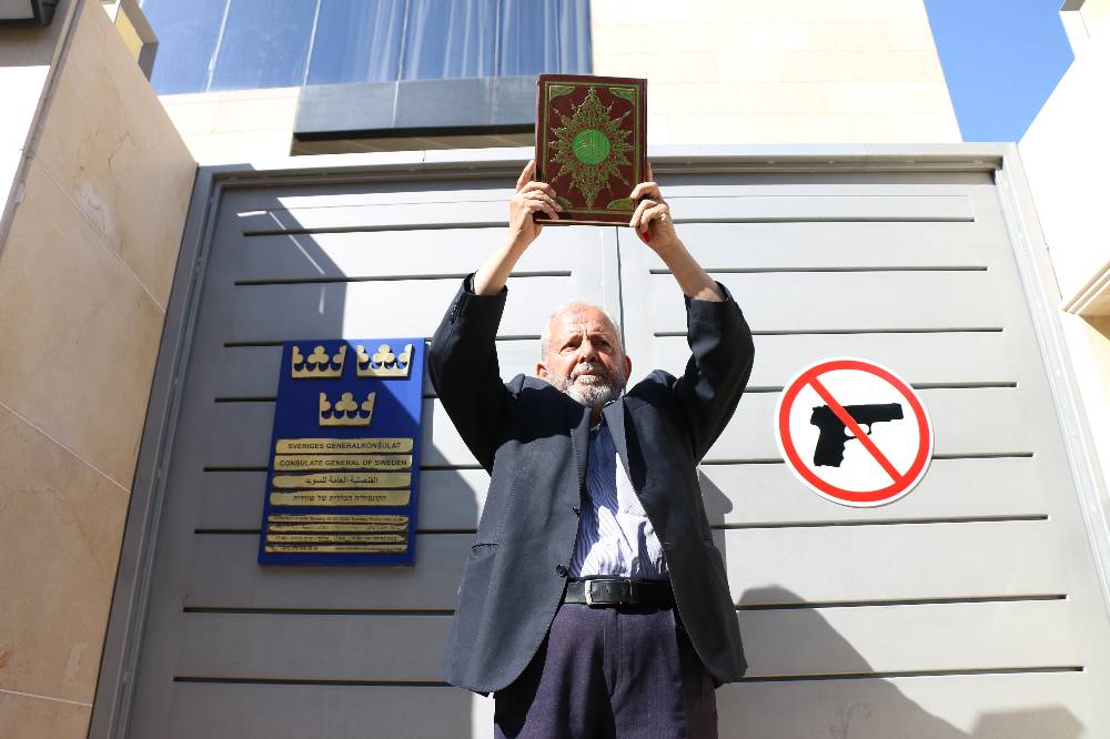 К началу акции у посольства собралось порядка 50 человек, преимущественно журналисты. Человек, организовавший акцию, достал из сумки зажигалку, после обратился к журналистам по-шведски со словами: "Я — мусульманин и ничего сжигать не буду". После этого он выбросил зажигалку, взял из сумки Коран и показал его всем присутствующим.