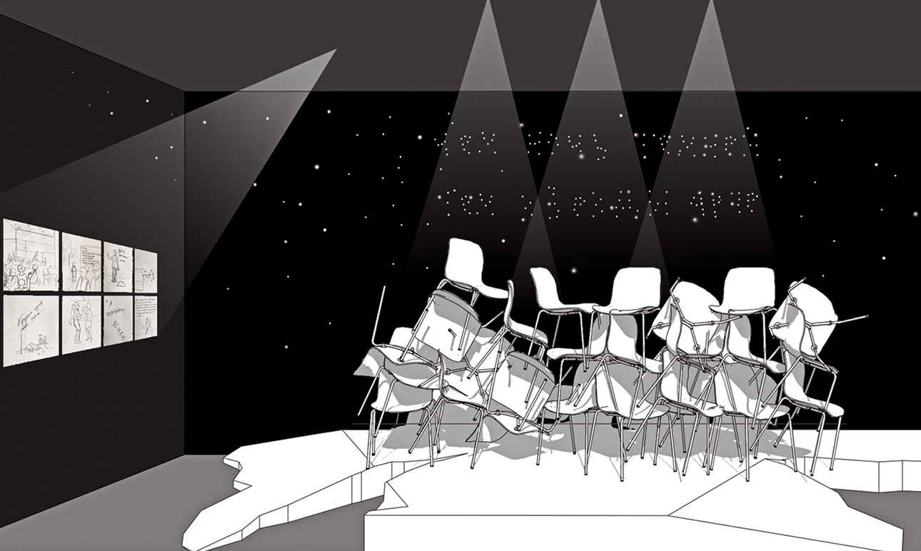 Из лесной библиотеки зритель попадет на баррикаду из стульев, плывущую на льдине в ночи. Теперь мы в Новосибирске, всматриваемся в архив Интегрального музея-квартиры Академгородка, откуда художница Гульшат Губайдуллина вытащила космический смысл. Инсталляция «Лед тронулся» отсылает к истории дискуссионного клуба «Под интегралом», который существовал в новосибирском Академгородке в оттепельное время, 1963–1968 годах. Его архив сохранила основательница музея Анастасия Близнюк-Безносова. Название проекта взято из заголовка билета на один из вечеров клуба. Из артефактов тут еще книга «Жизнь в раю», сборник стихов «Кругом шумит тайга» и другая литература из библиотеки клуба «физиков и лириков».