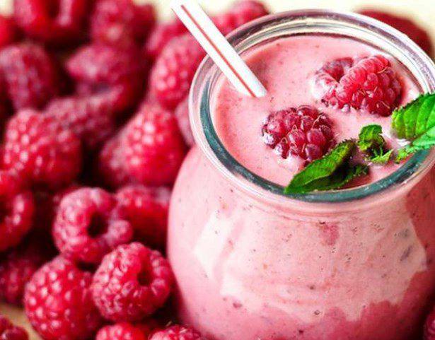 2. Блендером взбейте персики с малиной, йогуртом и молоком. Если хотите, добавьте немного мёда для сладости и ванильный экстракт для аромата.