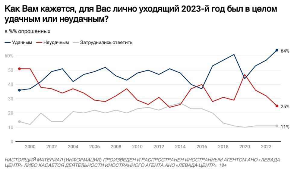 Рекордные 64% россиян считают, что уходящий год лично для них был в целом удачным.