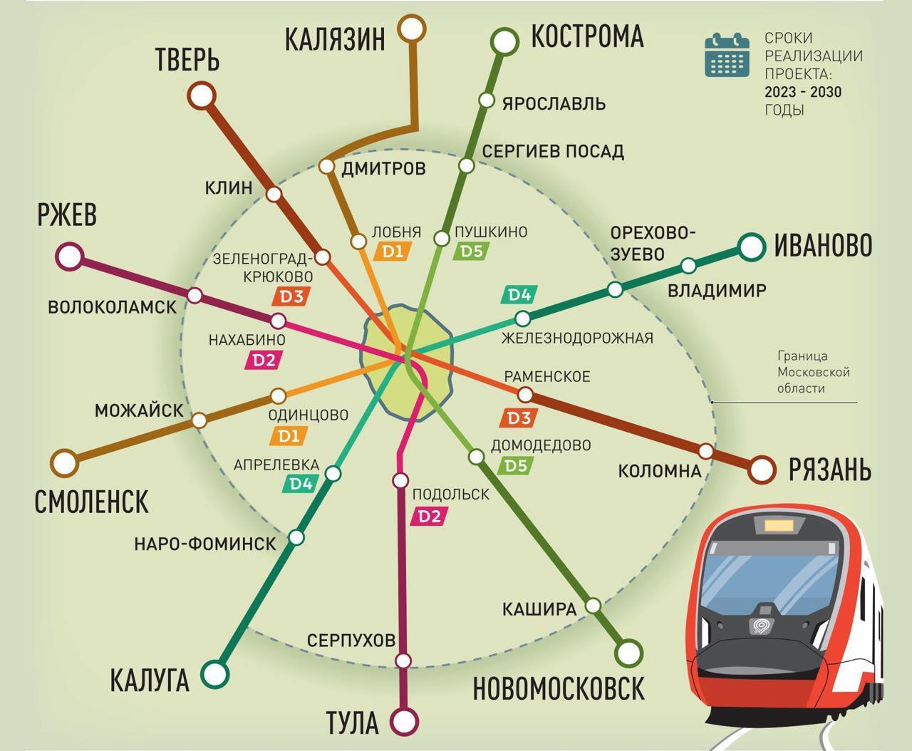Проект затронет в том числе Павелецкое и Ярославское направления московской железной дороги, которые по планам должны были стать частью пятого диаметра, но включение их в систему МЦД было отложено до 2026 года.