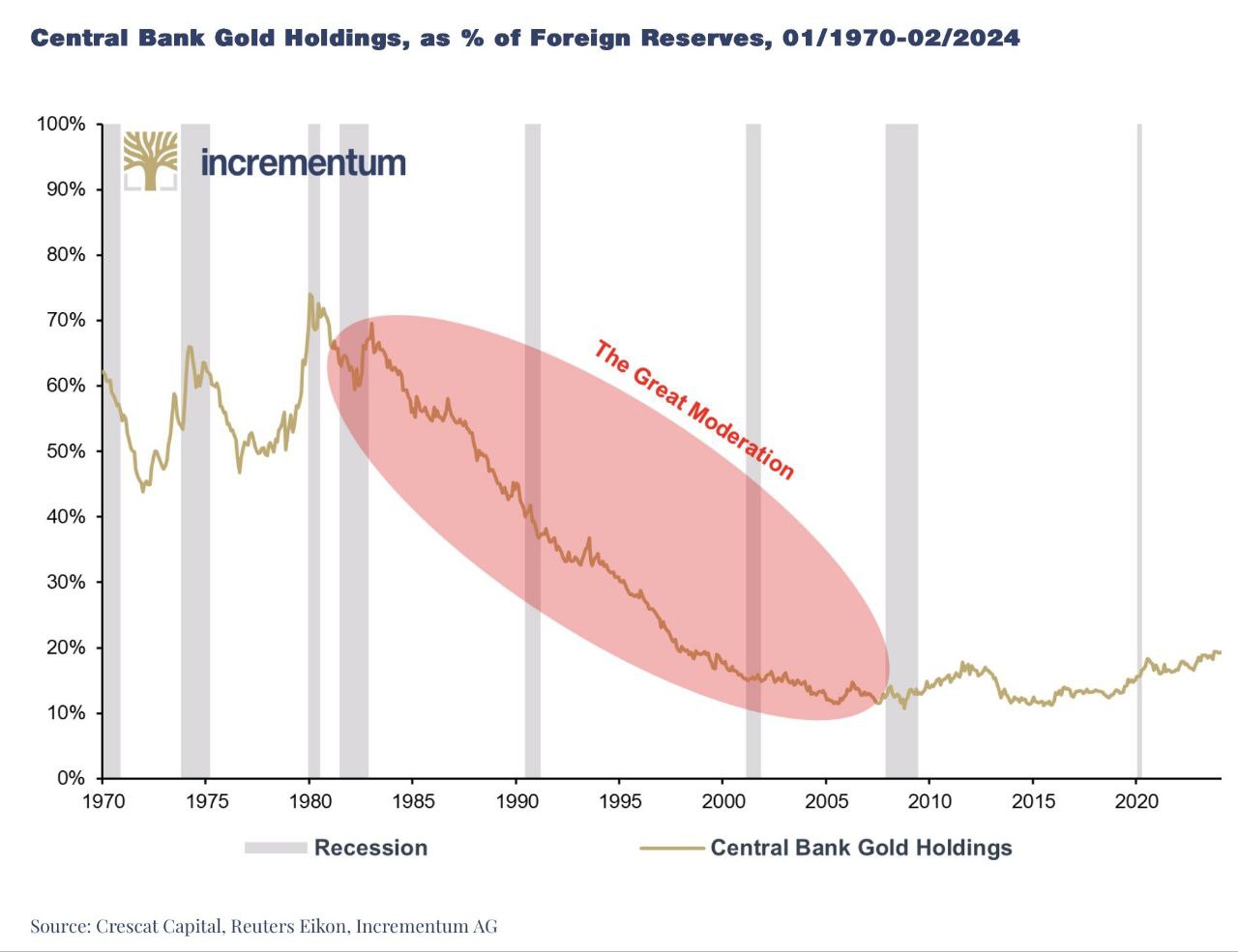 Центральные банки стремительно скупают золото. Желтый металл рухнул с огромных 80% иностранных резервов до всего лишь 15% за три десятилетия. Однако сейчас происходит разворот: впервые с конца 1980-х годов золото снова становится любимым активом среди Центральных банков.