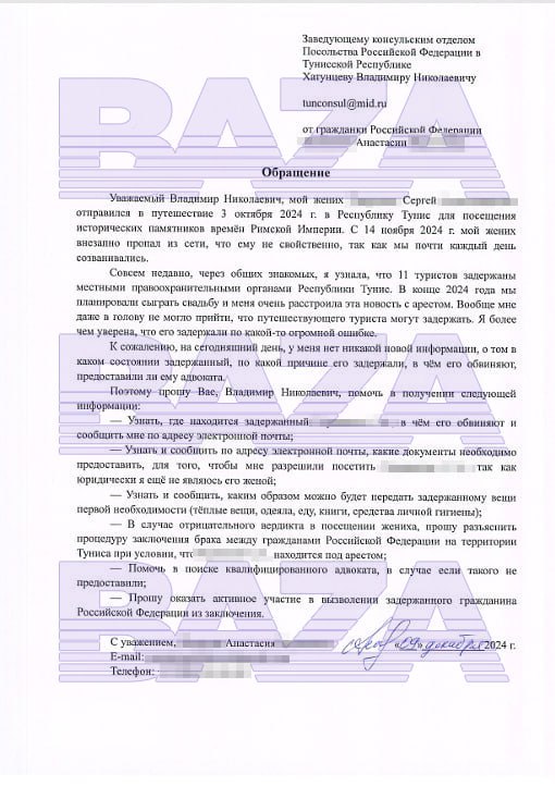 По словам Анастасии, вскоре Сергей перестал бы быть для неё третьим лицом — пара планировала свадьбу как раз в конце года, по возвращении парня. Но сейчас связи с ним нет почти месяц. Анастасия даже думала ехать за Сергеем в Тунис, но у неё нет никакой информации и она не знает языка. Пока девушка вместе с родственниками друзей Сергея написала петицию на имя президента Туниса Каиса Саида с просьбой отпустить их родных и близких.