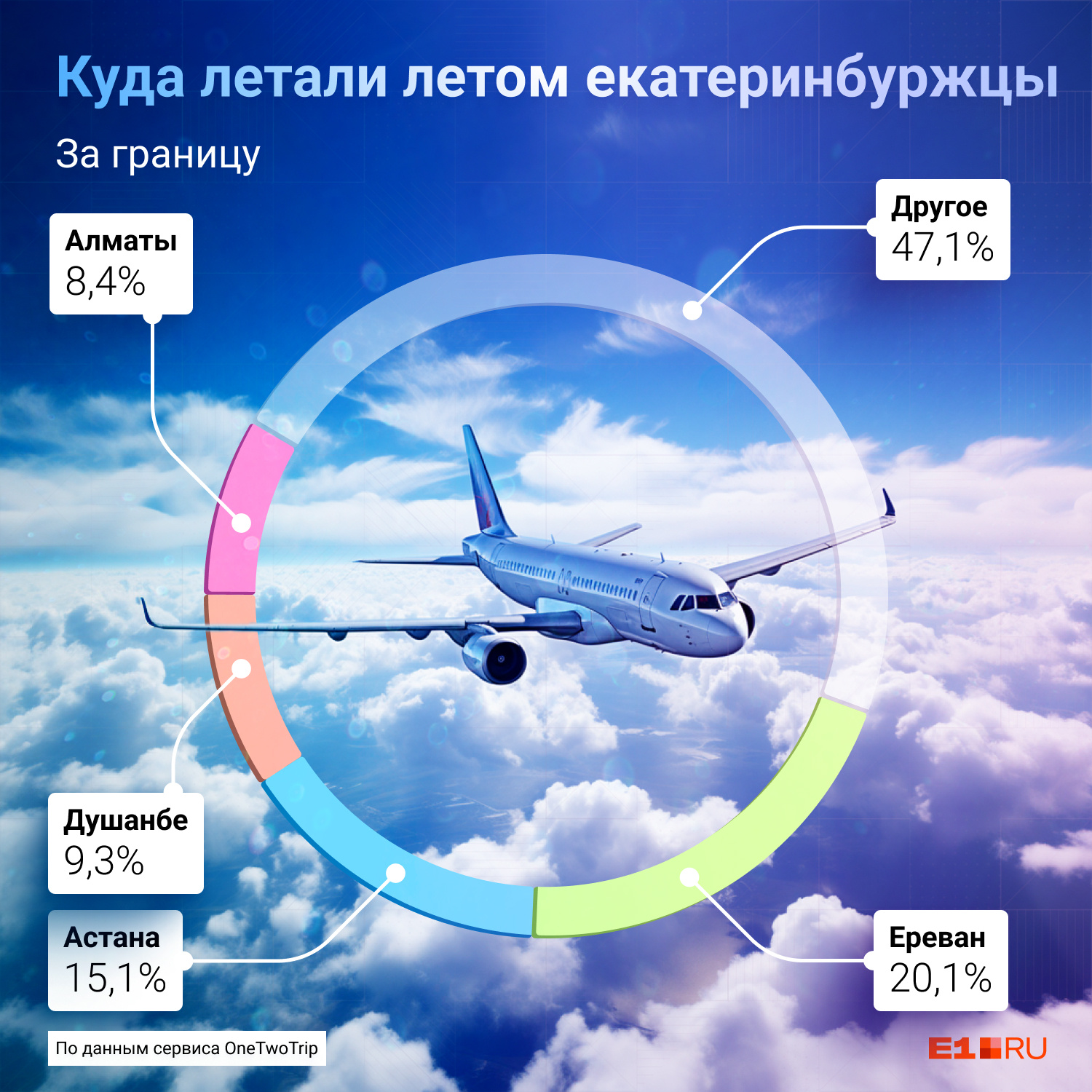 Самыми популярными международными направлениями за прошедшие три месяца у жителей столицы Урала стали Ереван, Астана и Душанбе. Также в топ-10 попали Алма-Ата, Анталья, Баку, Худжанд, Стамбул и киргизские города Ош и Бишкек. Такие данные озвучили аналитики сервиса OneTwoTrip, проанализировав все летние бронирования авиабилетов.