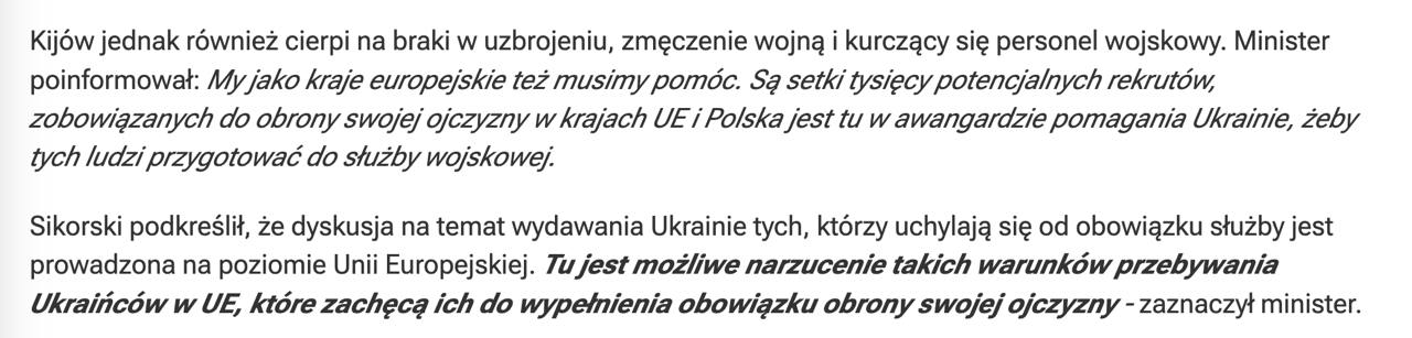 Мы, как европейские страны, тоже должны помочь. В странах ЕС находятся сотни тысяч потенциальных призывников, обязанных защищать свою родину, и Польша находится в авангарде помощи Украине в подготовке этих людей к военной службе".