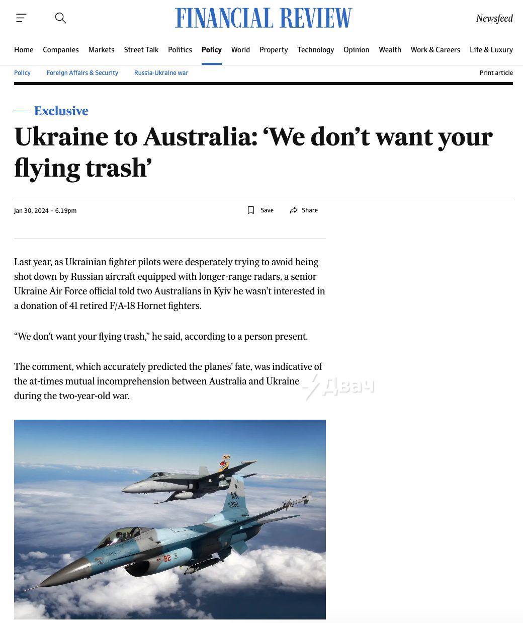 π€‘ΠΠΠ‘ Π£ΠΊΡΠ°ΠΈΠ½Ρ ΠΎΡΠΊΠ°Π·Π°Π»ΠΈΡΡ ΠΎΡ Π°Π²ΡΡΡΠ°Π»ΠΈΠΉΡΠΊΠΈΡ F-18 Hornet, Π½Π°Π·Π²Π°Π² ΠΈΡ Β«Π»Π΅ΡΠ°ΡΡΠΈΠΌ ΠΌΡΡΠΎΡΠΎΠΌΒ» β Π³Π°Π·Π΅ΡΠ° Australian Financial Review.