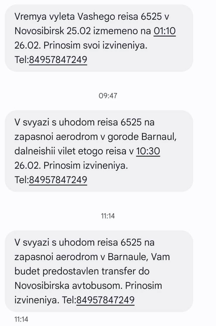 — Кружили минут 30, потом сказали, что туман не рассосался, летим в Барнаул на дозаправку и после в Новосибирск. Прилетели, из самолета нас не высаживали, просидели примерно час, потому что другие самолеты также были на дозаправке, — объясняет девушка.