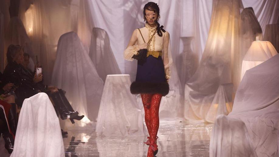 Ses amis sont tous venus, Elton John, Harry Styles, Jared Leto, Carla Bruni, mais aussi François-Henri Pinault accompagné de Salma Hayek, qui n'est autre que son ancien employeur chez Kering et qui a, entre-temps, pris une participation auprès du fonds d'investissement qatari propriétaire de Valentino... Les lieux ont des airs de château abandonné où le mobilier est recouvert de draps blancs, le sol est un immense miroir brisé. La grande parade de Michele peut commencer. Les mannequins hommes et femmes semblent presque errer dans ce labyrinthe, sortant d'un bal oublié, avec chapeaux, voilettes, gants de dentelles. C'est à la fois très Michele dans sa relecture du vintage et sa silhouette chargée, et très Valentino dans les robes de cocktail à pois et à volants, dans les gilets gipsy et les petites vestes de couture folk, dans les jupons imprimés cachemire et les sublimes gilets brodés aux motifs antiques sur velours noir.