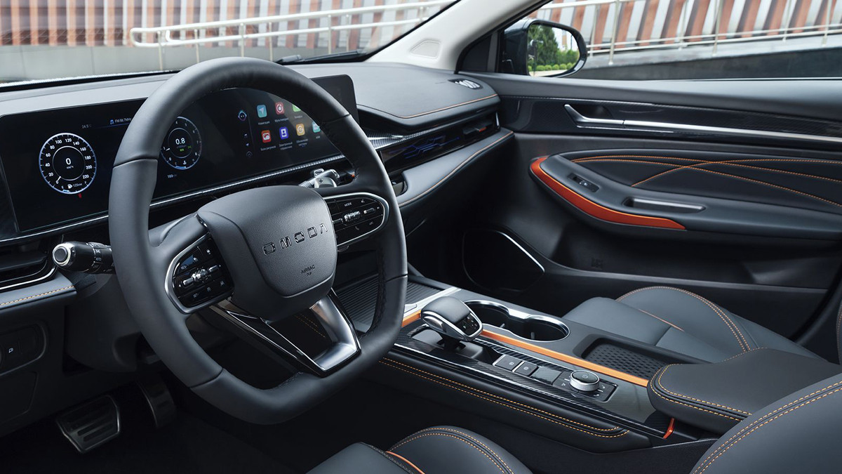 Так, Omoda S5 GT получила иной формы головную оптику с более «острыми» уголками ходовых огней, другую радиаторную решётку и передний бампер (отметим, «гриль» спортивной версии напоминает «веретенообразную» решётку, которую ранее использовала марка Lexus). Ещё автомобиль украсили чёрными декоративными элементами, которые поддерживаются оригинальными 17-дюймовыми колёсными дисками такого же цвета, а за ними видны оранжевые тормозные суппорты. Корма почти такая же, за исключением иного оформления нижней части заднего бампера.