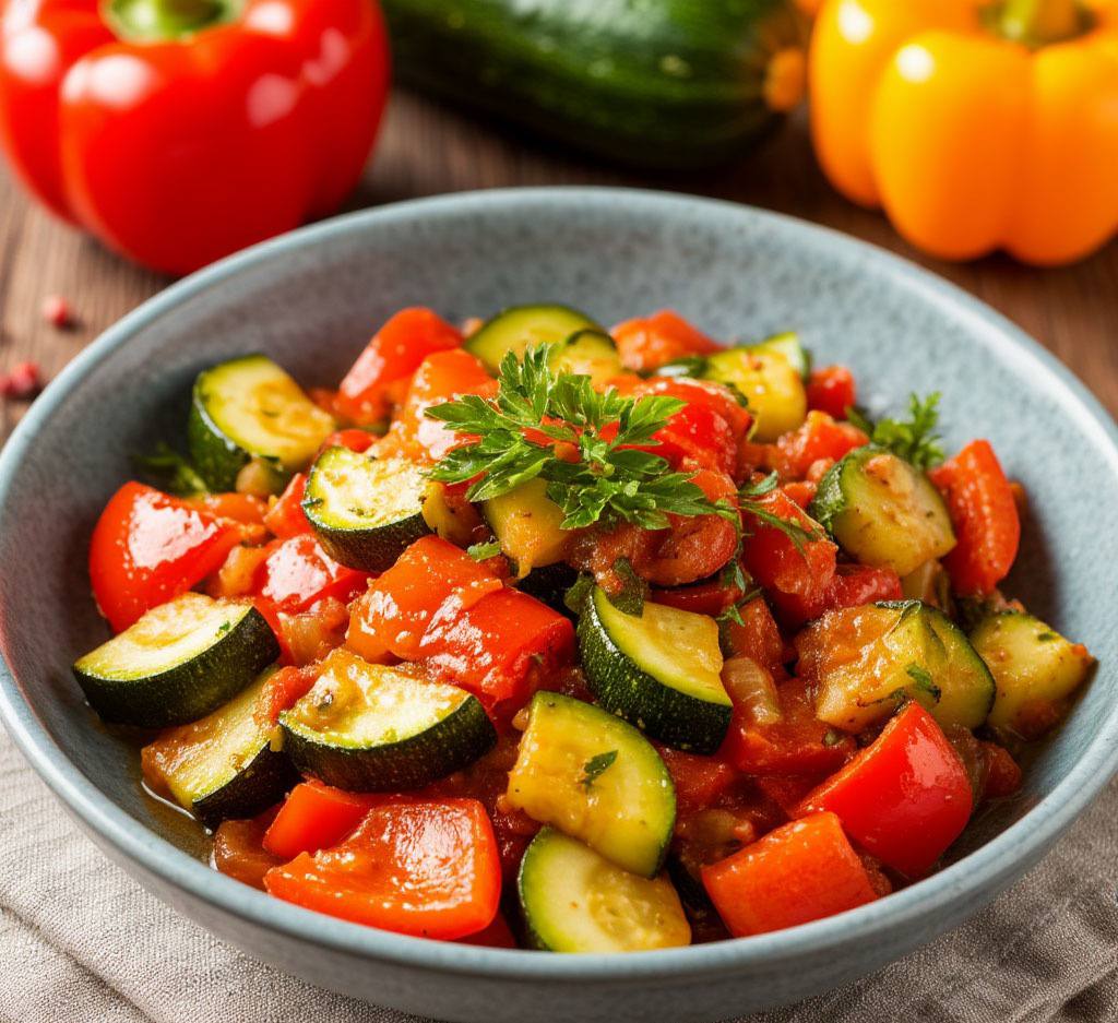Кабачки, тушенные с помидорами и перцем