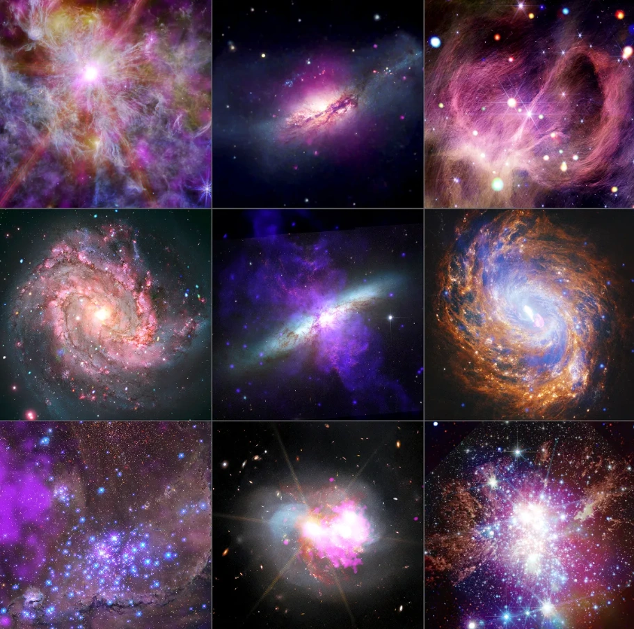 Астрономы опубликовали девять впечатляющих рентгеновских снимков, полученных с помощью обсерватории Chandra X-ray Observatory в сочетании с данными от James Webb Space Telescope и Hubble Space Telescope. Эти изображения позволили по-новому взглянуть на галактики, черные дыры, области звездообразования и другие удаленные астрономические объекты.