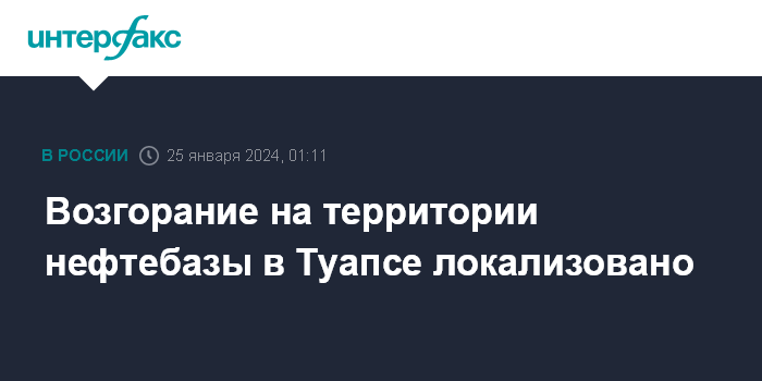 Москва. 25 января. INTERFAX.RU - Спасатели локализовали возгорание на территории нефтебазы в городе Туапсе Краснодарского края, сообщает глава Туапсинского района Сергей Бойко.