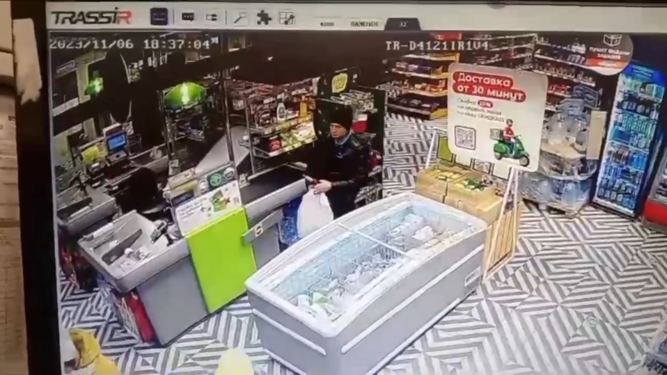 На представленной полицией записи мужчина в черной шапке и кожанке зашел в известный сетевой магазин на улице Энтузиастов и вынес без оплаты продукты (кофе, масло и т. д.). Похититель складывал продукты в пакет и во внутренний карман куртки.
