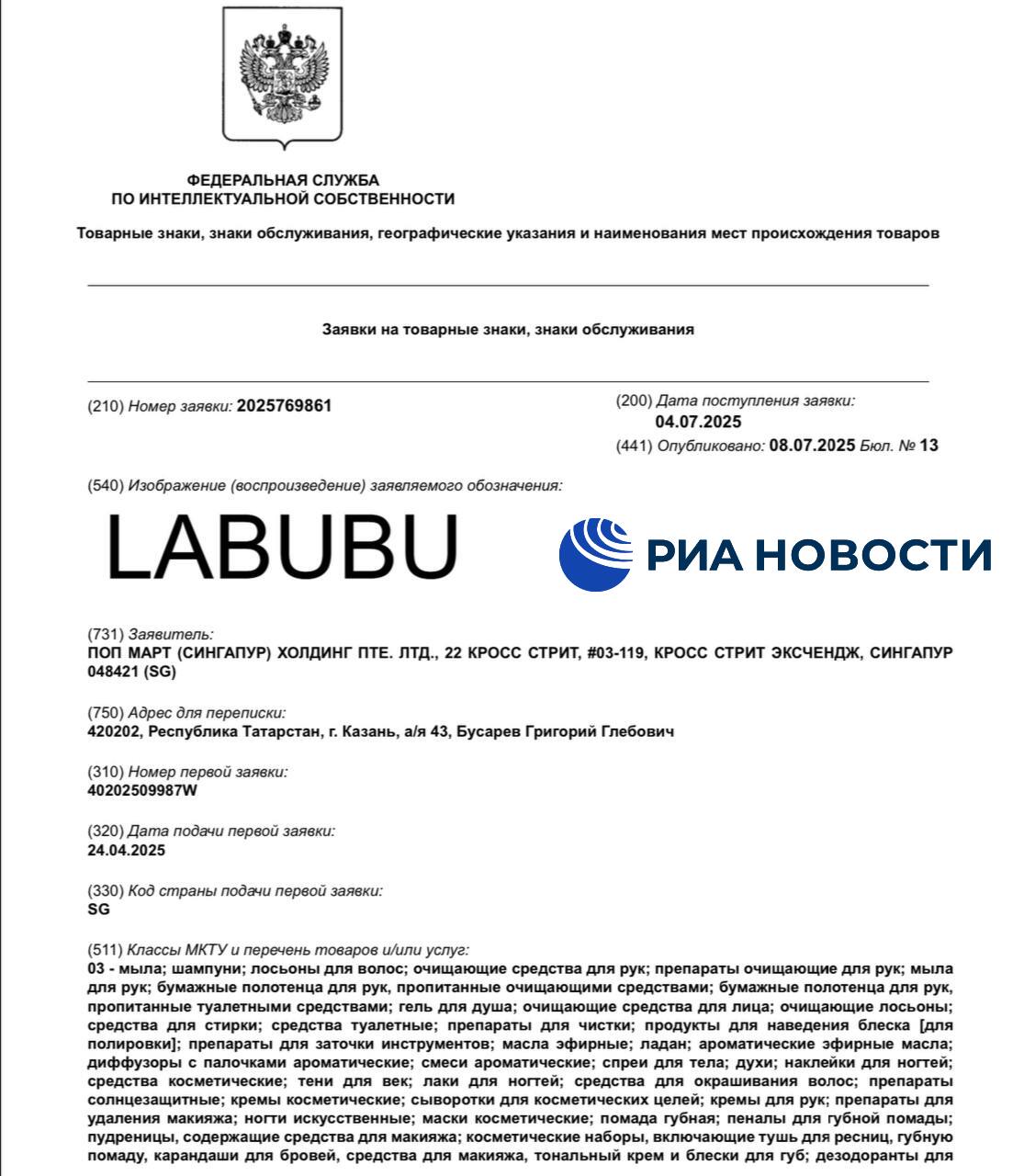 Производитель игрушек Лабубу Pop Mart хочет зарегистрировать в России товарный знак Labubu, выяснил корреспондент РИА Новости.