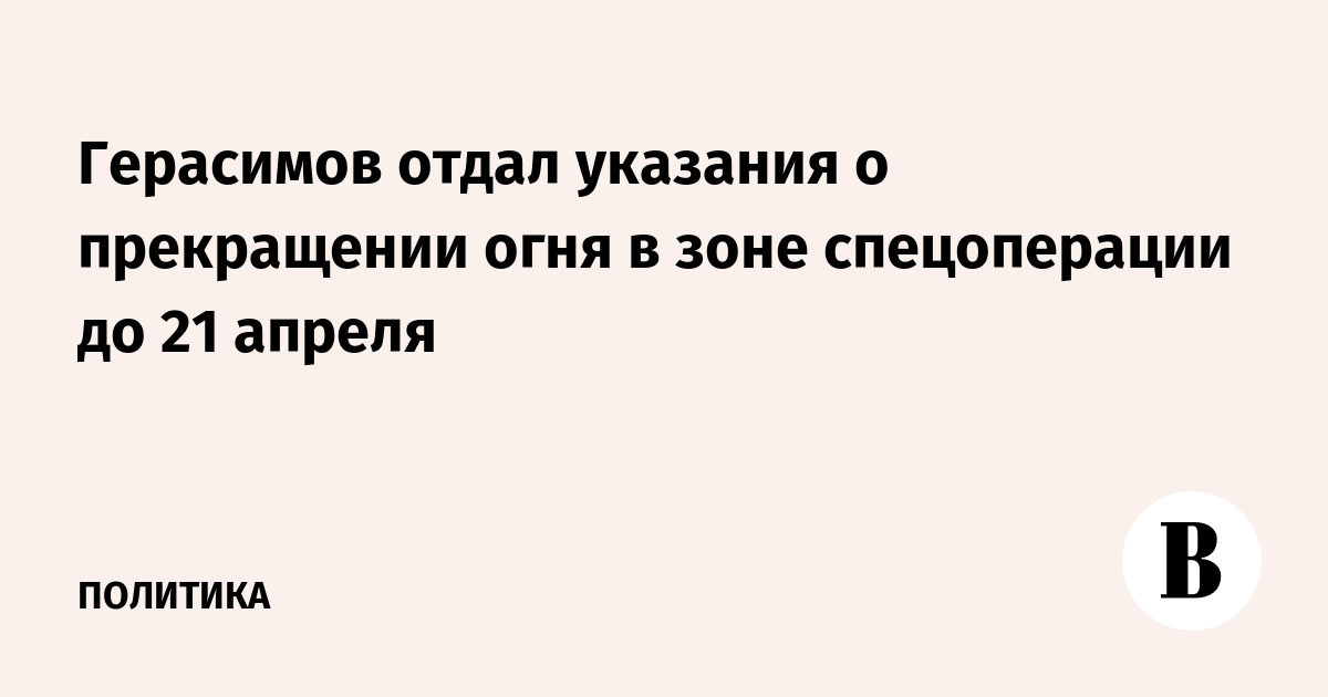Начальник Генерального штаба Вооруженных сил (ВС) РФ Валерий Герасимов отдал указания всем командующим группировок в зоне спецоперации о прекращении огня и ведения боевых действий с вечера 19 апреля, сообщает Telegram-канал Минобороны РФ.
