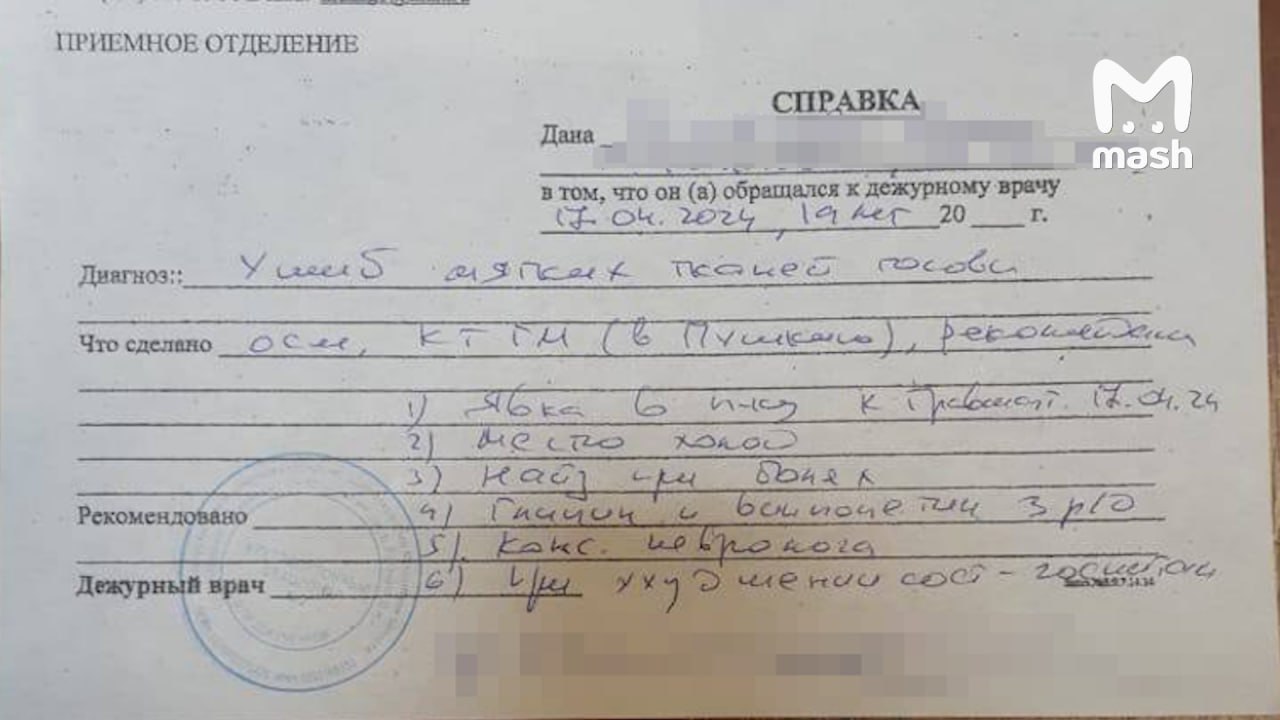 Как рассказала Mash Мария (имя изменено), 17 апреля поздно вечером она возвращалась домой с собакой. Следом в помещение за ней зашёл мужчина — на вид славянской внешности, с заострённым носом и в кепке. И с размаху разбил бутылку о голову девушки. Затем в ход пошли кулаки. Её полугодовалый щенок испугался и не знал, что делать.