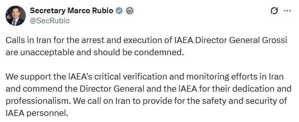 По его словам, США ценят работу агентства по контролю за ядерными объектами и высоко оценивают профессионализм Гросси и сотрудников МАГАТЭ. Рубио добавил, что Вашингтон призывает Тегеран обеспечить безопасность и защиту персонала миссии.