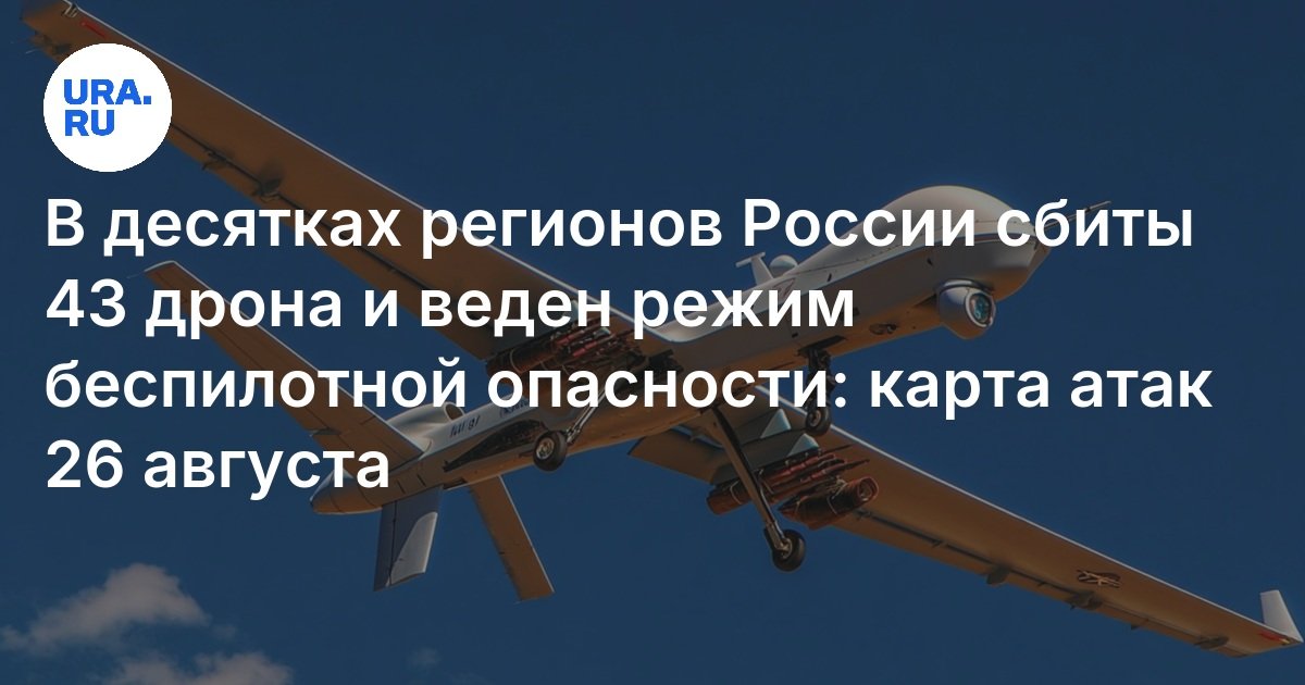 В ночь на 26 августа украинская армия атаковала беспилотниками около шести регионов России. В ряде областей зафиксированы повреждения жилых домов и другой инфраструктуры. Также из-за угрозы ударов БПЛА в семи регионах вводился режим соответствующей опасности и временно прекращали работу аэропорты. В Минобороны РФ сообщили, что за ночь над регионами страны сбито 43 украинских дрона. Подробнее о ночных ударах по России — в материале URA.RU.