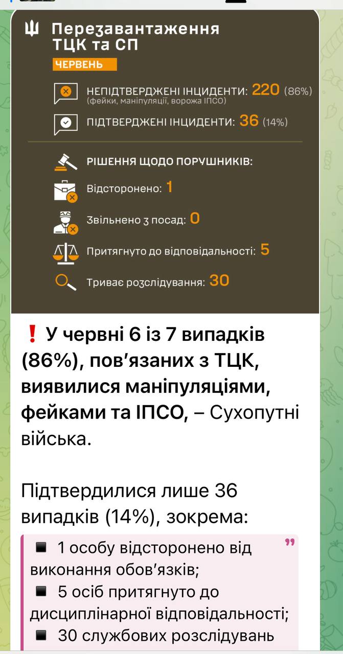 В июне 6 из 7 случаев (86%), связанных с ТЦК, оказались манипуляциями, фейками и ИПСО – Сухопутные войска.