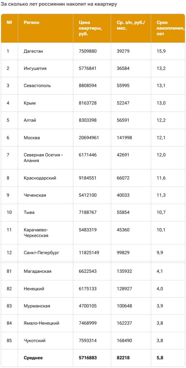 Чтобы купить среднюю квартиру в Москве, нужно не есть и не пить 12 лет при зарплате в 140 тысяч рублей, пишут РИА Недвижимость. Дольше всего копить на квартиру на вторичном рынке придется жителям Дагестана (почти 16 лет), а также Ингушетии, Севастополя и Крыма (примерно по 13 лет). Легче всего накопить на вторичное жильё жителям Чукотки и ЯНАО — 3,8 года. @banksta