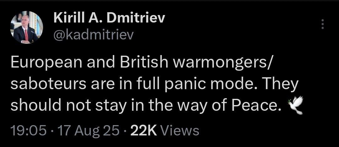 войны/саботажники находятся в состоянии полной паники. Они не должны стоять на пути к миру..."Глава РФПИ и собеседник Уиткоффа Кирилл Дмитриев прокомментировал намечающийся массовый вылет европейских лидеров в Вашингтон.