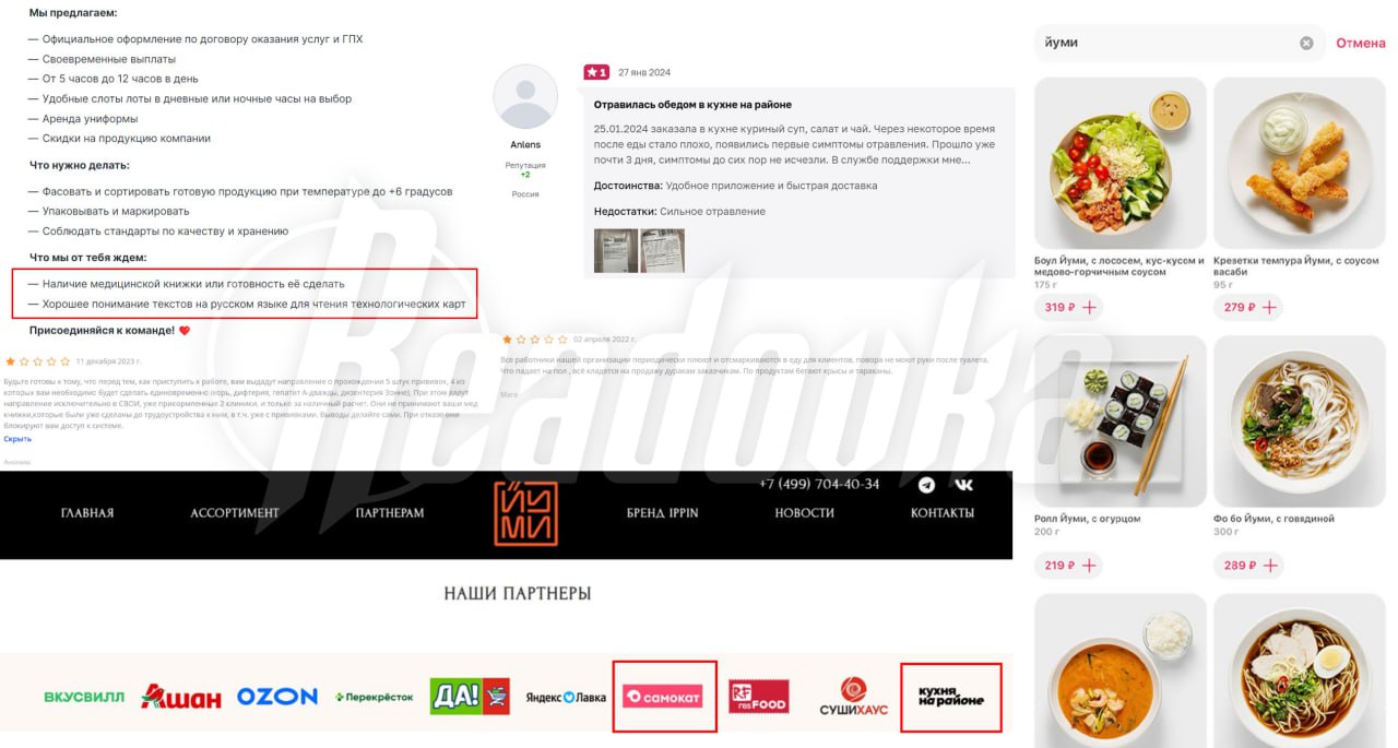 Антисанитария, переклеенные маркировки и отравления — как была организована работа в хипстерских «Самокате» и «Кухне на районе» Как выяснила Readovka, впервые в «Самокате» узнали о некачественной продукции «Кухни на районе» примерно пять дней назад — как раз тогда появились первые сообщения о массовых случаях ботулизма в Москве. Именно через этот сервис реализовывалась продукция «Кухни». Ко всему прочему, у тесно связанных компаний были примерно одни и те же поставщики. Например, «ЙУМИ», чья продукция реализовывалась как через «Самокат», так и через «Кухню на районе». Как сообщил наш источник, салатом с тунцом и фасолью этой фирмы тоже отравились клиенты, однако проблемные блюда продолжают присутствовать в ассортименте «Самоката». Изначально утилизировать продукцию вообще не планировалась, рассказал Readovka источник из «Самоката», — всю еду от «Кухни» просто сложили в холодильники, и только накануне СанПиН приехал забирать всю продукцию на проверку. В свою очередь, один из бывших су-шефов «Кухни» сообщил нам, что нарушения были и среди руководителей компании и поставщиков — по его словам, «любую бумажку можно было подделать». В отзывах бывшие сотрудники делятся, что повара не моют руки, по кухне бегают вредители, упавшую на пол еду спокойно кладут в заказ. Оно и неудивительно, учитывая, что стать поваром в обоих сервисах можно даже без опыта работы — для трудоустройства надо лишь пройти формальную медкомиссию. Паспорт гражданина РФ, конечно, тоже не нужен: от поваров требуется элементарное знание русского языка, причем на уровне «понимания технологических карт». Клиенты же со своей стороны уже давно рассказывают в сети об отравлениях после блюд из «Кухни». И это накладывается на все отзывы о неправильной маркировке и повреждении целостности упаковки. Все это серьезные нарушения, которые по российскому законодательству грозят как минимум приостановкой работы на три месяца и крупными штрафами (куда большими, чем ранее отделывалась «Кухня»). Вызывает вопрос и тот факт, почему продолжает работать «Самокат» — ведь две компании связаны настолько, что, по информации Readovka, курьеры «Кухни» после ее закрытия перешли работать в розовый сервис доставки.