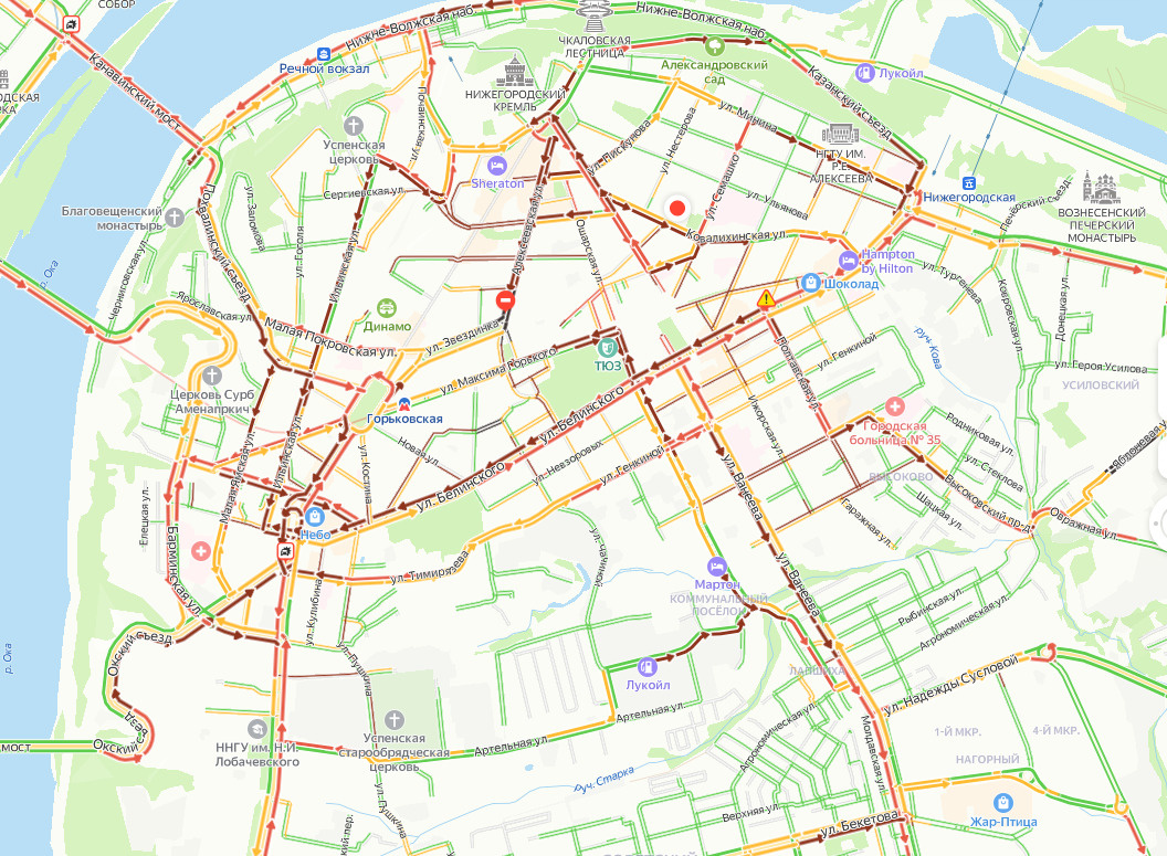 Стоит отметить, что в пробках город стоит практически весь день. Так, в середине дня Нижний встал из-за пожара на Звездинке. Там сгорело историческое здание, а потому поток машин и общественного транспорта направили по узким прилегающим улицам, что привело к заторам.
