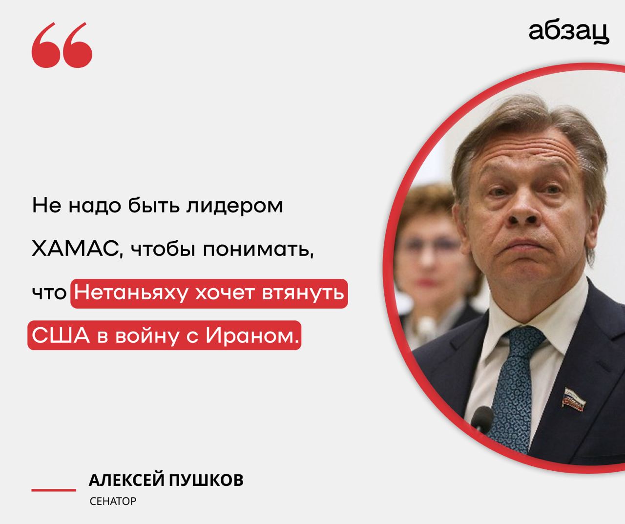 Пушков: Нетаньяху хочет втянуть США в войну с Ираном Это главная цель Нетаньяху в течение последних десяти лет, и она очевидна – расправиться с Ираном руками США, подчеркнул сенатор. «Для этого Нетаньяху долгие годы неустанно доказывал, что у Ирана уже есть ядерное оружие. Он это утверждал даже тогда, когда Иран был очень далёк от собственной атомной бомбы». По словам Алексея Пушкова, удар Израиля по консульству Ирана в Дамаске был лишён всякого смысла, кроме одного – спровоцировать ответный ракетный удар и вынудить США начать войну с Ираном. Подписывайтесь на «Абзац»