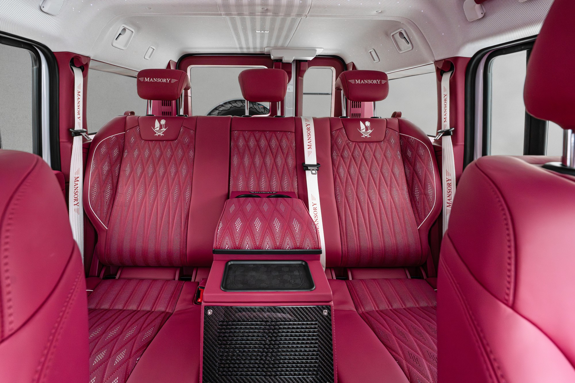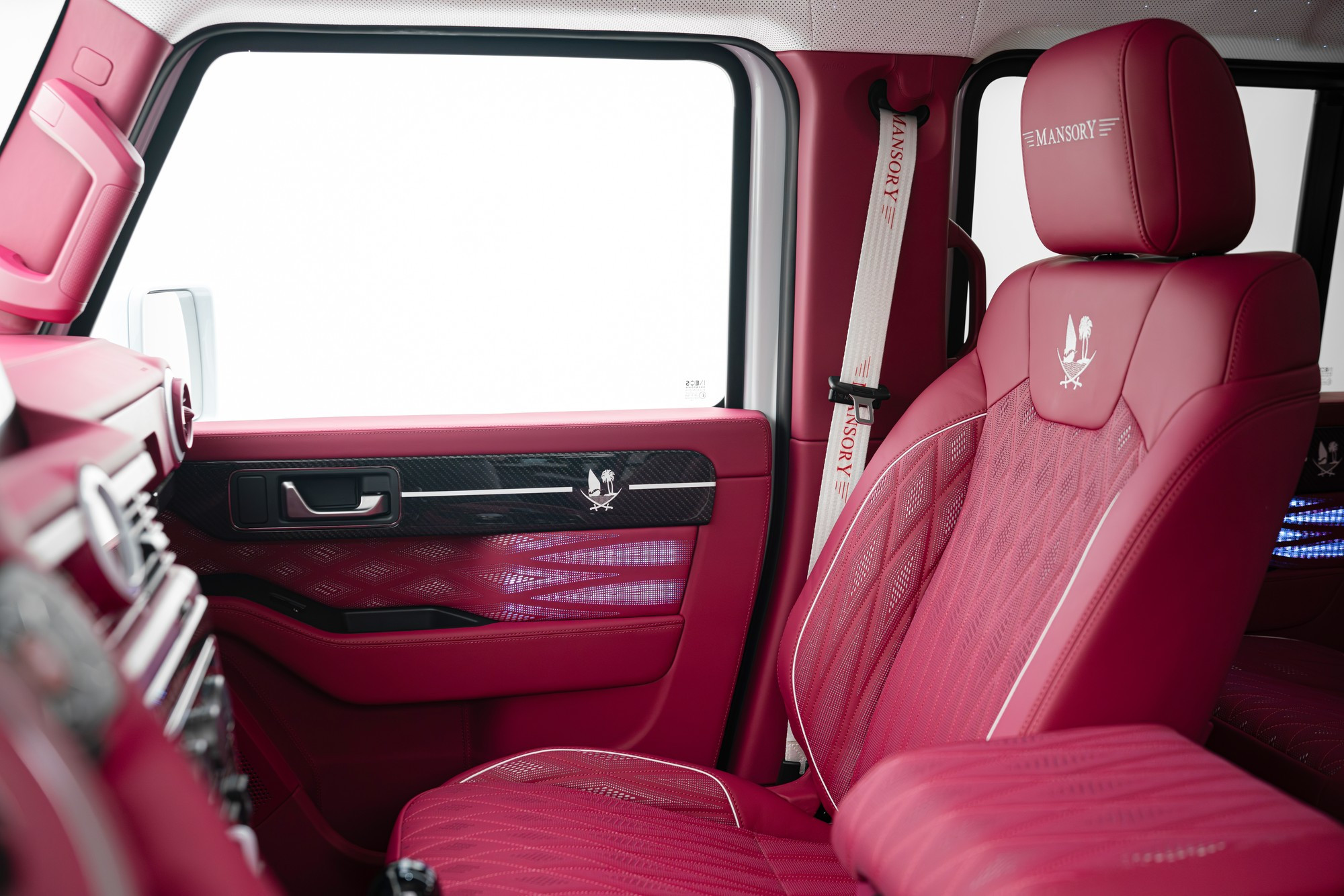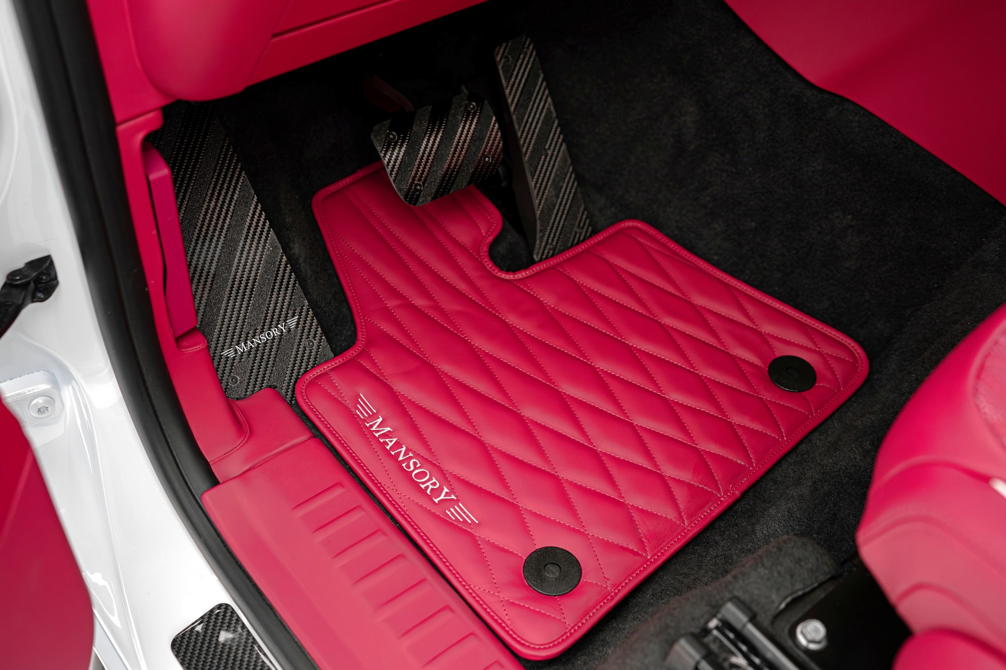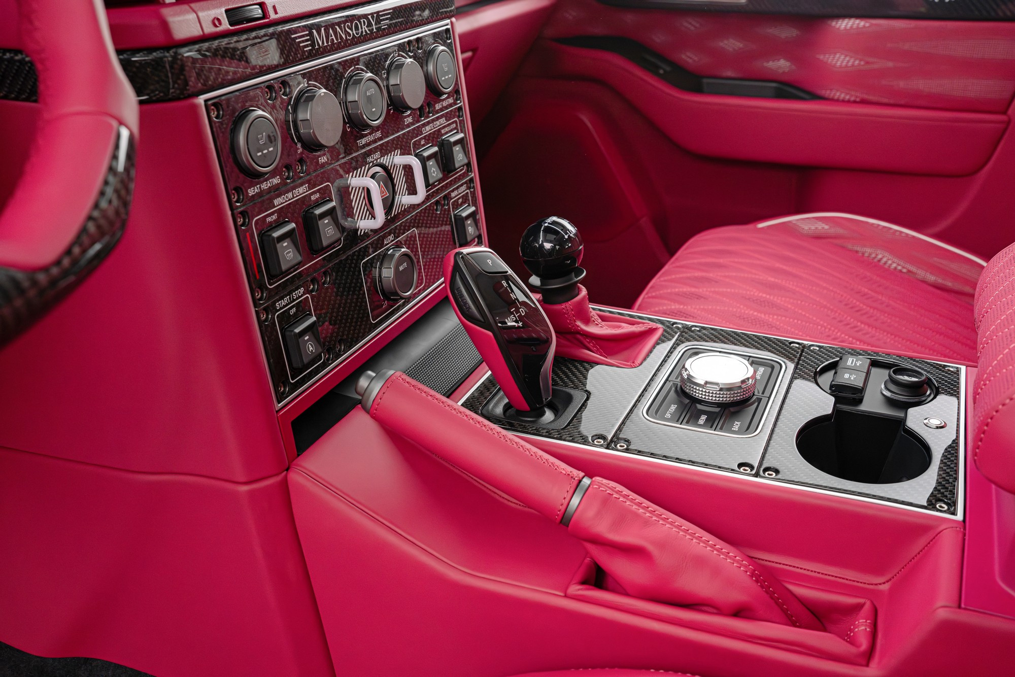 Салон полностью перешит нежной перфорированной кожей, на демо-образце она окрашена в насыщенный розовый цвет, но каждый клиент, разумеется, может выбрать свой цвет из практически безграничной палитры. Двигатель теперь запускается не ключом, а поворотным тумблером на потолочной консоли. Сама потолочная консоль теперь выполнена из углепластика, этим же материалом декорированы центральная консоль, центральный тоннель, передняя панель, руль, дверные карты и даже педали. Дверные карты вдобавок получили светодиодную подсветку. Россыпь светодиодов также украшает потолок. Все кресла оснащены подогревом и вентиляцией. Задний диван стал фактически двухместным, так как по центру установлен многофункциональный бокс-подлокотник с холодильником. Между передними креслами имеется свой холодильник. На пол уложены стёганые коврики от Mansory. Углепластиковые накладки на порогах с надписью Mansory оснащены подсветкой.