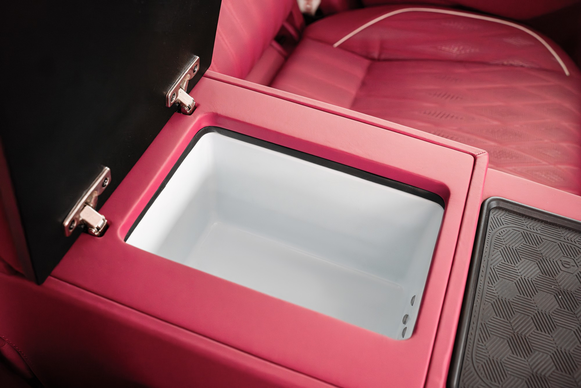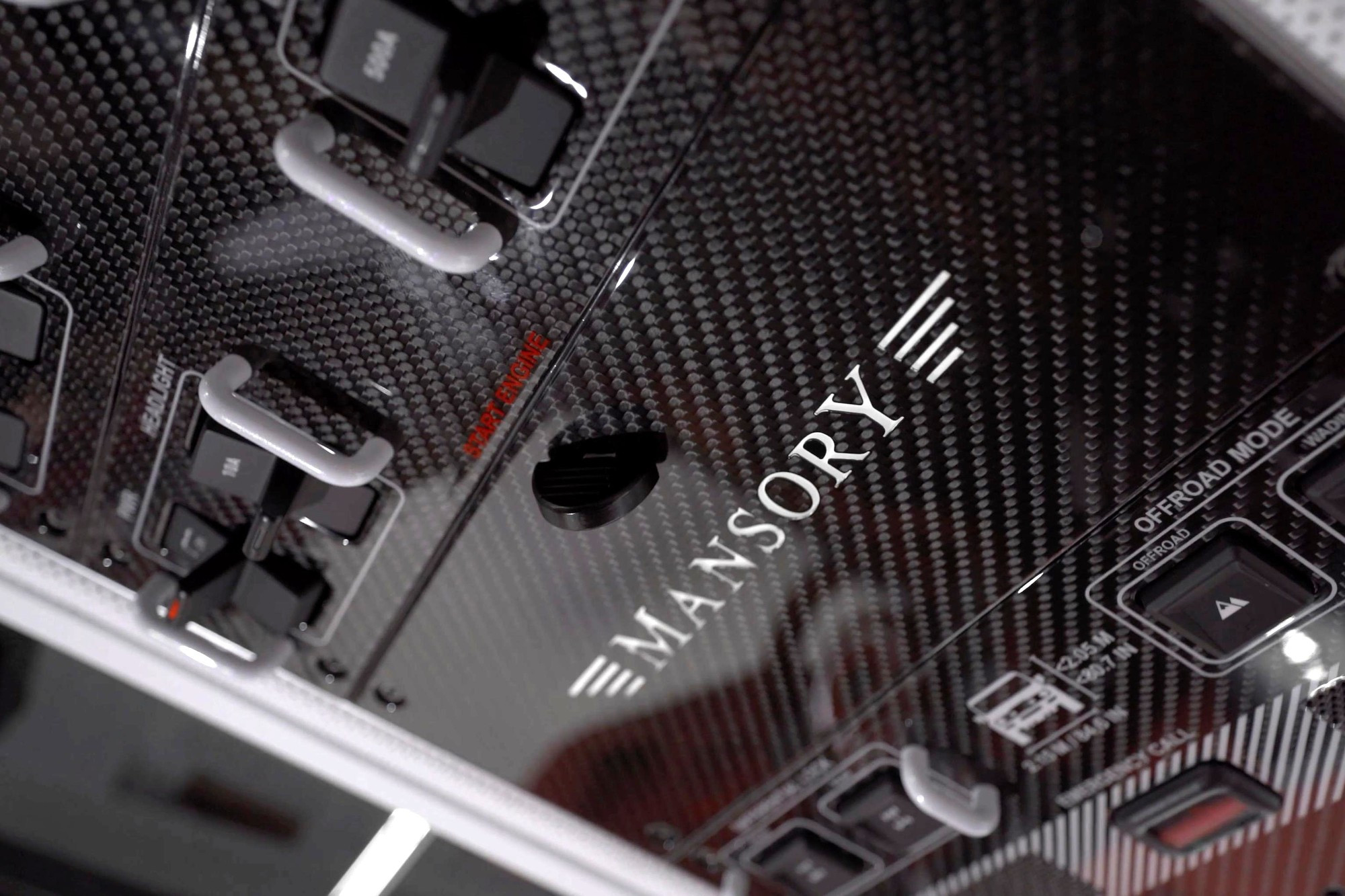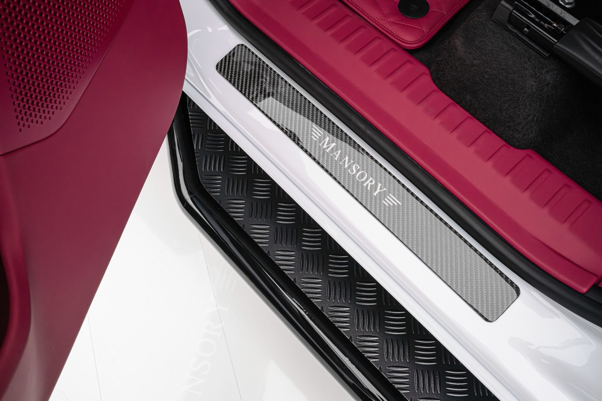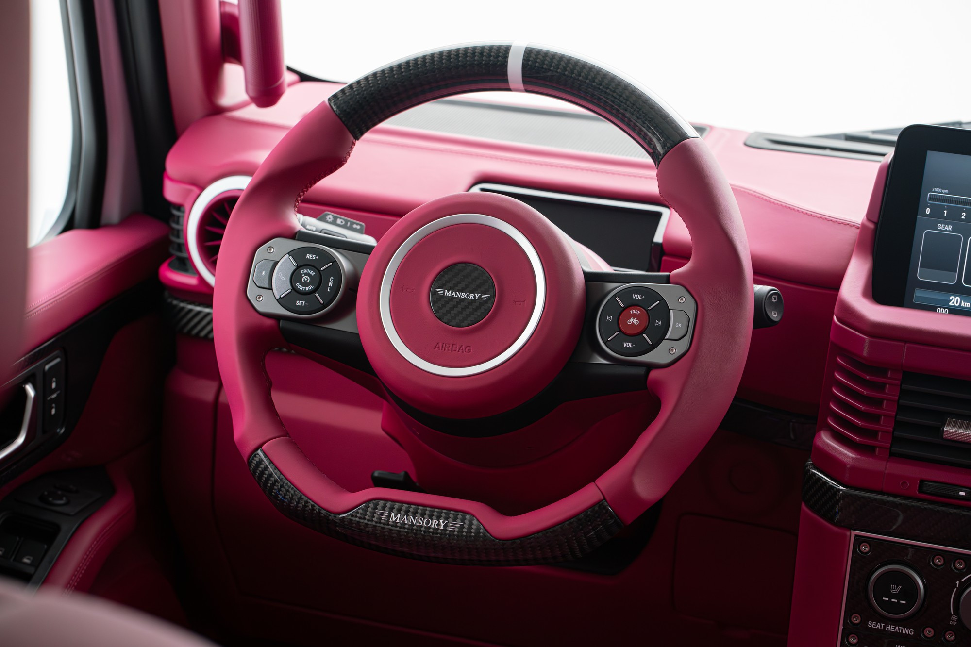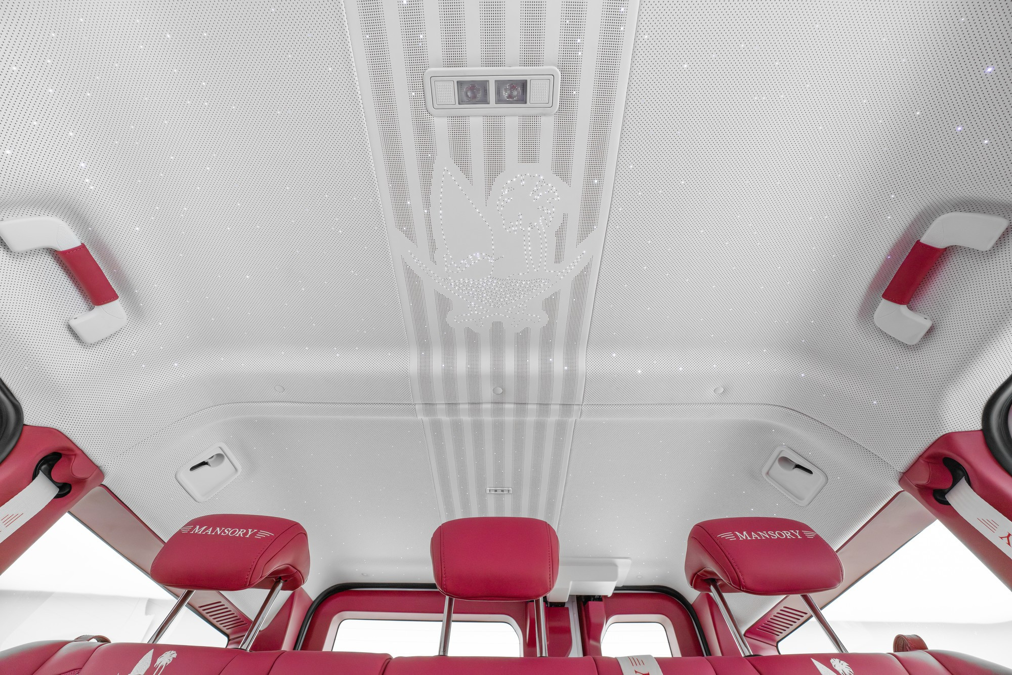 Салон полностью перешит нежной перфорированной кожей, на демо-образце она окрашена в насыщенный розовый цвет, но каждый клиент, разумеется, может выбрать свой цвет из практически безграничной палитры. Двигатель теперь запускается не ключом, а поворотным тумблером на потолочной консоли. Сама потолочная консоль теперь выполнена из углепластика, этим же материалом декорированы центральная консоль, центральный тоннель, передняя панель, руль, дверные карты и даже педали. Дверные карты вдобавок получили светодиодную подсветку. Россыпь светодиодов также украшает потолок. Все кресла оснащены подогревом и вентиляцией. Задний диван стал фактически двухместным, так как по центру установлен многофункциональный бокс-подлокотник с холодильником. Между передними креслами имеется свой холодильник. На пол уложены стёганые коврики от Mansory. Углепластиковые накладки на порогах с надписью Mansory оснащены подсветкой.