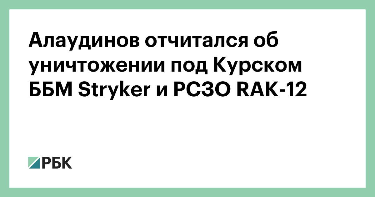 Российские военные за прошедшие сутки уничтожили на курском направлении боевую бронированнюу машину (ББМ) Stryker, реактивную систему залпового огня (РСЗО) RAK-12, зенитный ракетно-пушечный комплекс (ЗРПК) «Тунгуска», а также два пункта управления дронами — в общей сложности более десяти единиц техники. Об этом в своем телеграм-канале сообщил командир спецназа «Ахмат» генерал-майор Апты Алаудинов.