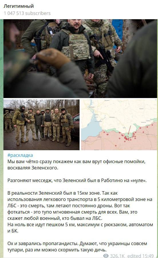 Фейк: Владимир Зеленский посетил село Работино на линии боевого соприкосновения. Кадры опубликовали официальный канал Зеленского и все украинские пропагандисты.