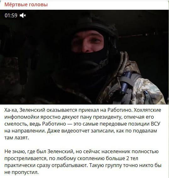 На предоставленных офисом президента Украины фото и видео нет ни одного подтверждения, что они сняты на месте боев, в том числе в Работино. На видео Зеленский награждает бойцов в каком-то подвале или туннеле, снять эти кадры можно было бы где угодно. Ни на одном из кадров не слышно звуков боя, например стрельбы или работы артиллерии. Президент Украины и его спутники не используют шлемы. Видно, что он приезжает в якобы Работино на автомобиле, однако, все дороги в той местности простреливаются артиллерией и FPV-дронами. Сбор большой группы людей немедленно вызвал бы прилет российского снаряда.