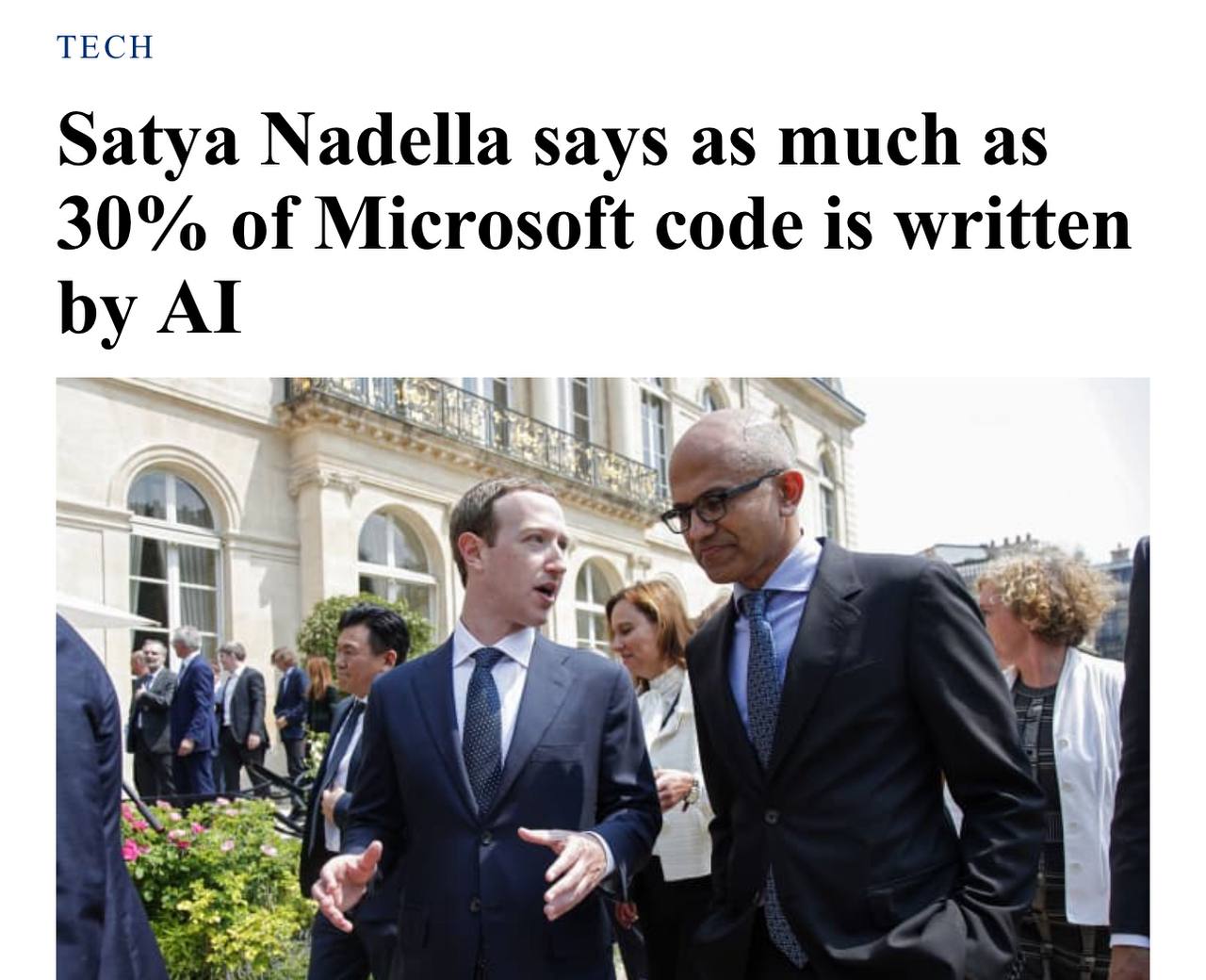 К 2030 году доля ИИ в разработке может достичь 95%. Часть проектов уже целиком создают с помощью нейросетей, говорит глава компании Сатья Наделла.