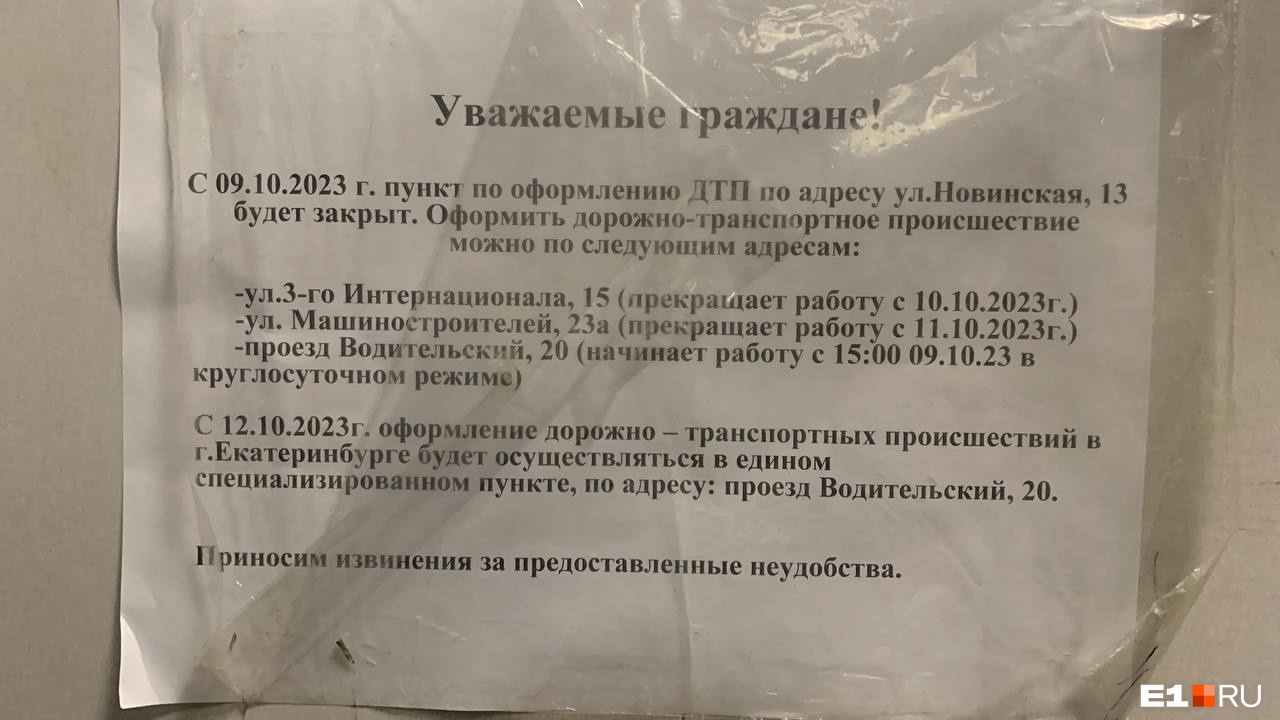 В Екатеринбурге начиная с 12 октября будет работать только один пункт оформления ДТП. Он расположен по адресу: Водительский проезд, 20 (рядом с Ботаникой, ориентир — Объездная дорога). В городской автоинспекции заверили, что работа будет идти штатно и больших очередей ждать не стоит.