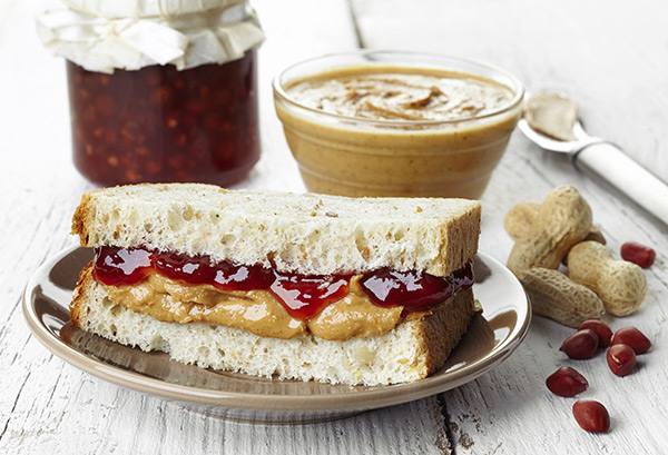 2. Один смазываем вареньем на выбор, другой арахисовой пастой и нарезаем на него кусочки банана, соединяем хрустящие тосты.