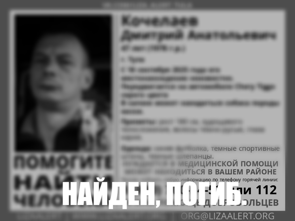 Пропавшего туляка Дмитрия Кочелаева нашли погибшим. Об этом 24 сентября сообщили волонтеры поискового отряда «ЛизаАлерт».