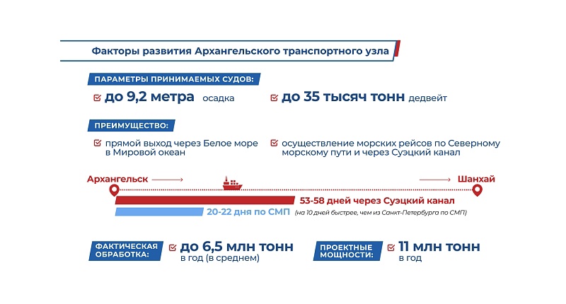 «У нашего порта есть преимущество, которое позволяет осуществлять морские рейсы как по Северному морскому пути, так и через Суэцкий канал: время следования судна из Архангельска в Шанхай через Суэцкий канал составляет 53–58 дней, а по Севморпути — в два с половиной раза меньше: 20–22 дня. Это на 10 дней быстрее, чем даже из Санкт-Петербурга по СМП», — подчеркнул Александр Цыбульский.