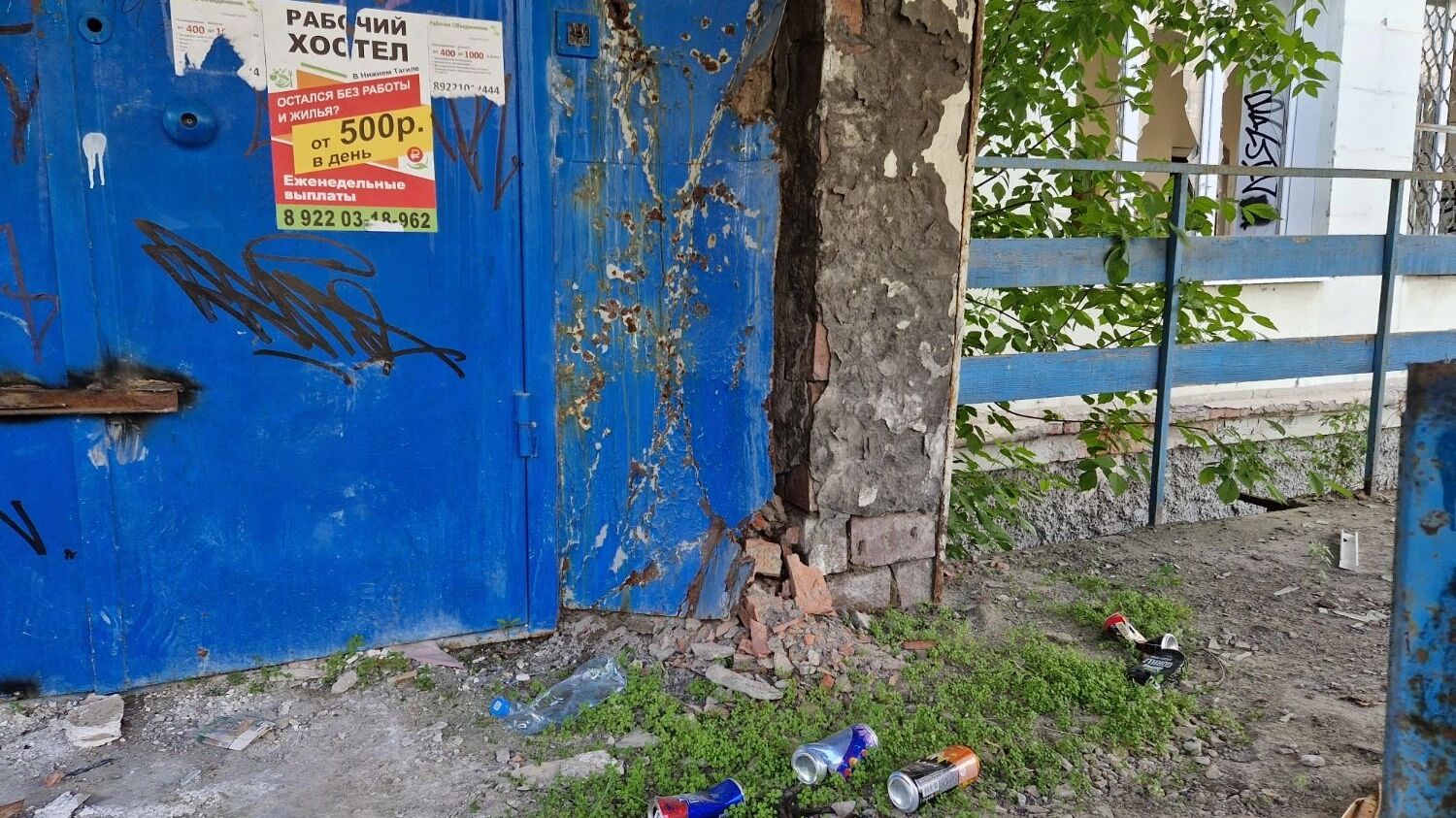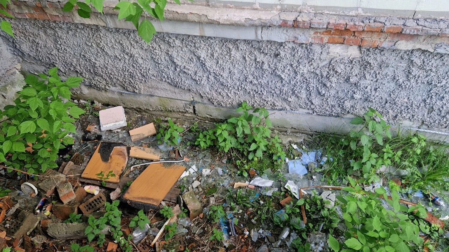 Вокруг здания тоже все запущено и заброшено, повсюду мусор, стекло и многое другое. Некогда крепкий кирпичный забор сломали.