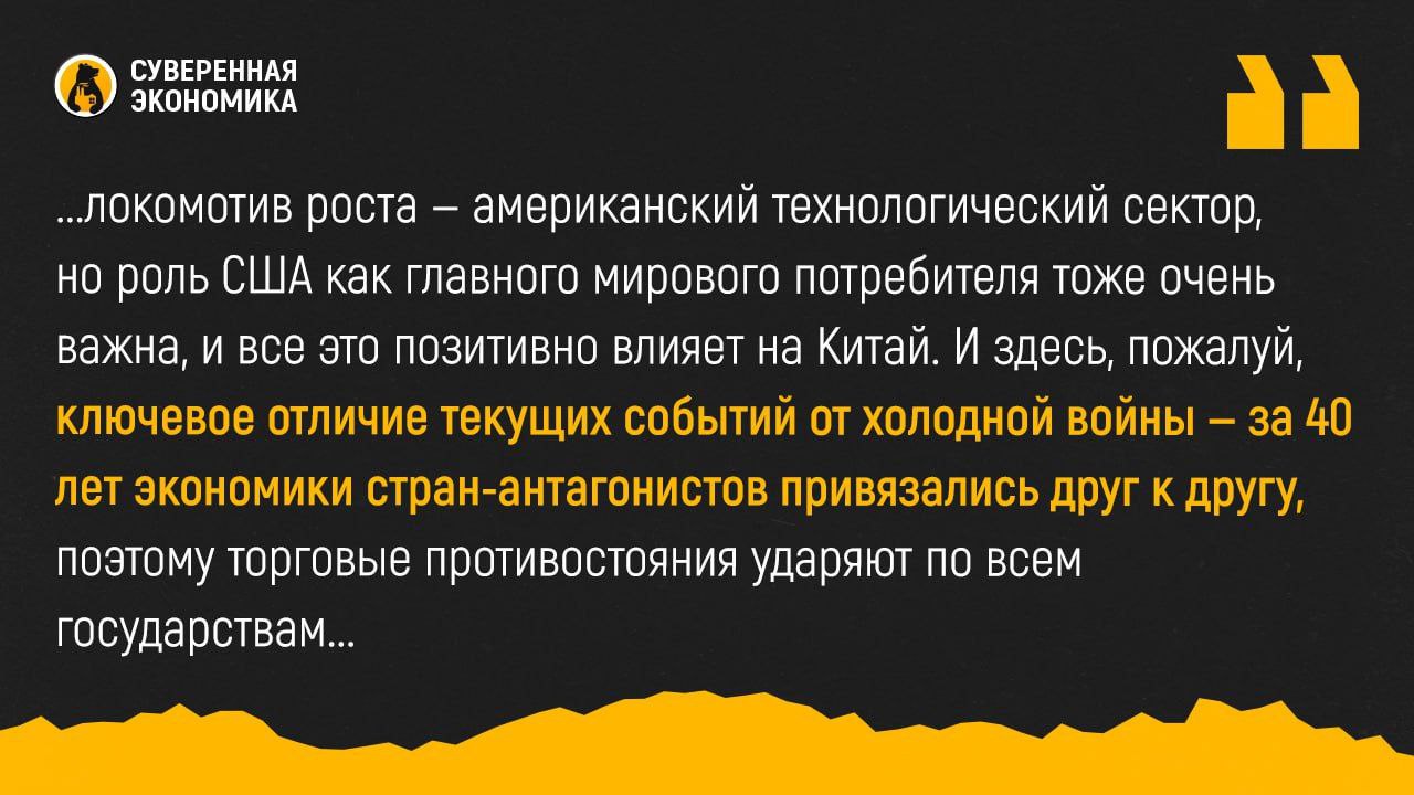 Тут очень показательно влияние США на остальной мир — как только началось ожидание снижения ставок, биржи тут же пошли вверх. Инвесторы стали перекладываться из облигаций в акции. Локомотив роста — американский технологический сектор, но роль США как главного мирового потребителя тоже очень важна, и все это позитивно влияет на Китай. И здесь, пожалуй, ключевое отличие текущих событий от холодной войны — за 40 лет экономики стран-антагонистов привязались друг к другу, поэтому торговые противостояния ударяют по всем государствам.