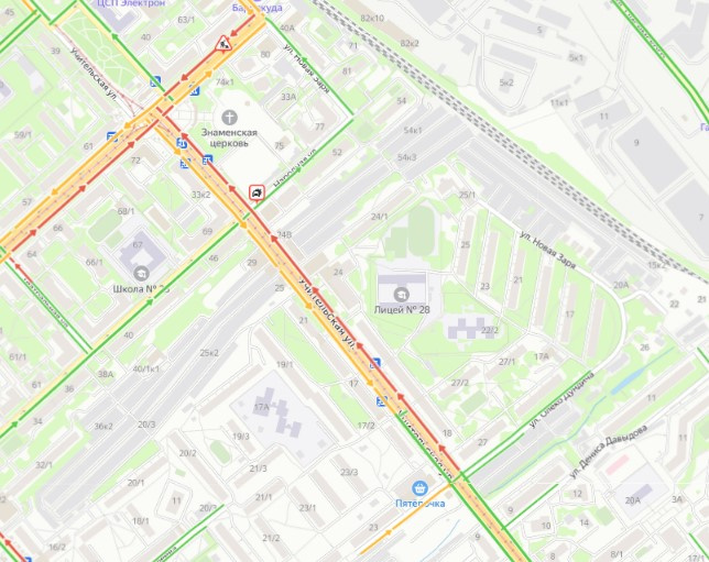 — Улица Учительская, пересечение с Народной. Полностью перекрыто движение по правой стороне двух полос. Приехала скорая, большая пробка.