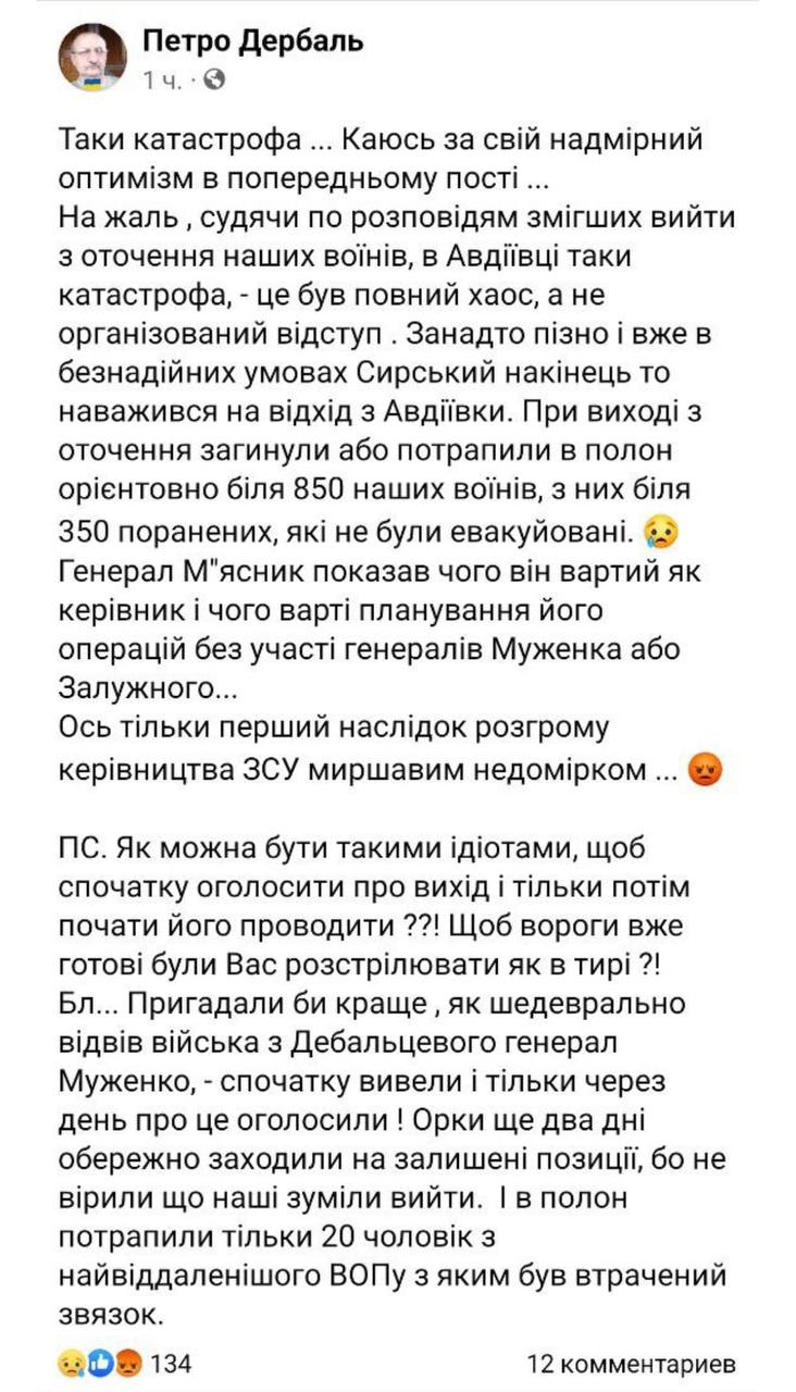 Украинский депутат Дербаль заявил, что при отступлении из Авдеевки ВСУ потеряли 850 человек убитыми и пленными и назвал это катастрофой, которая произошла по причине разгрома прежнего руководства ВСУ зеленым недомерком. Напрямую в катастрофе обвинил Сырского, который сначала объявил о начале вывода войск, а потом начал его осуществлять, что привело к резкому росту потерь при попытке вырваться из города.