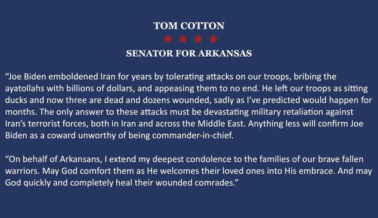 Группа американских сенаторов призывает власти нанести прямой удар по Ирану после атаки на американскую базу в Иордании