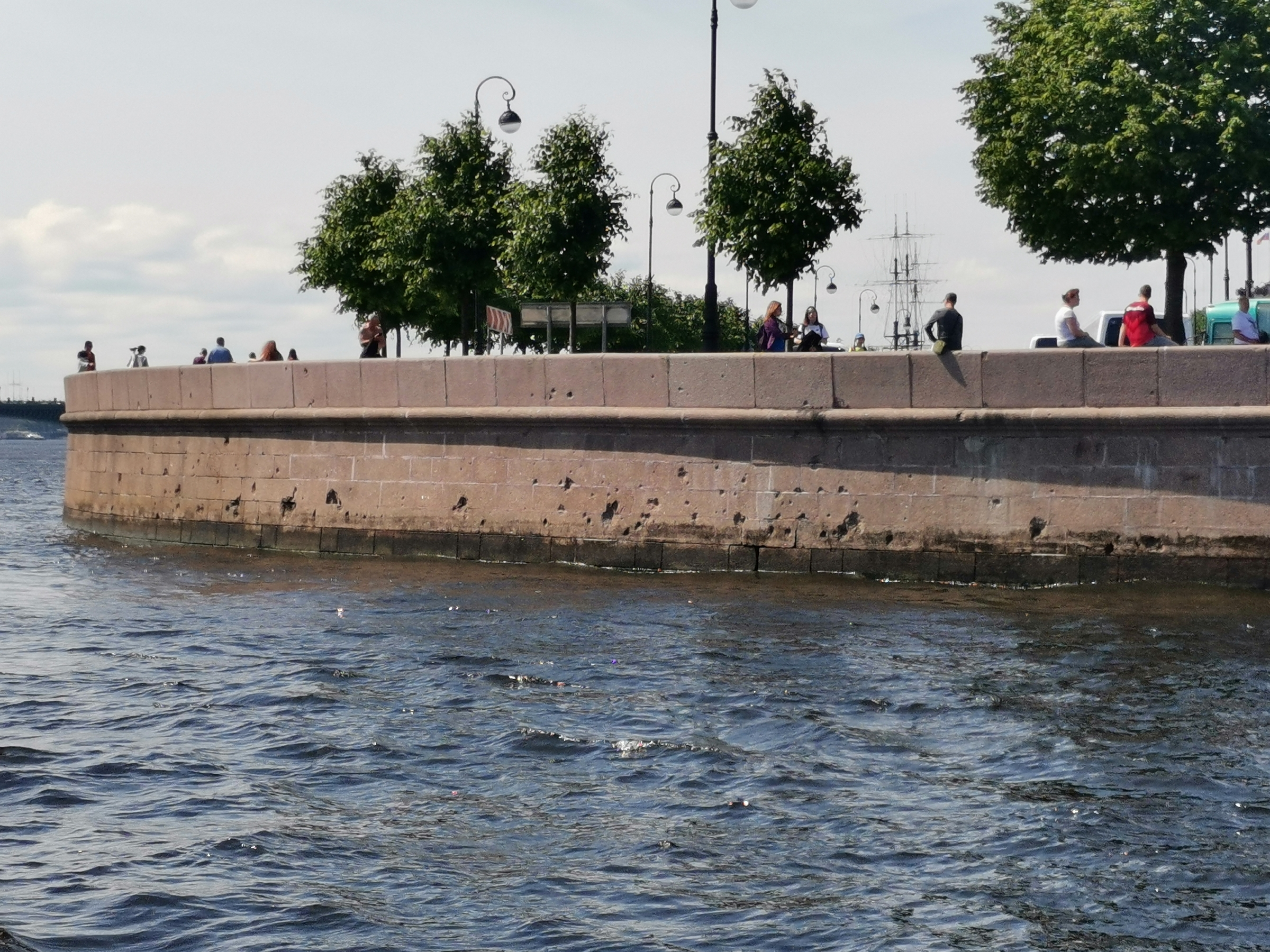Следы войны хранит Кронверкская набережная у Троицкого моста – их можно увидеть со стороны Петропавловской крепости. Выбоины на Петровской набережной видны с крейсера «Аврора». Изрешечен снарядами был участок набережной канала Грибоедова у дома №140. Сохранены следы осколков на Университетской набережной, напротив дворца Меншикова, а также на Английской, Дворцовой и других.