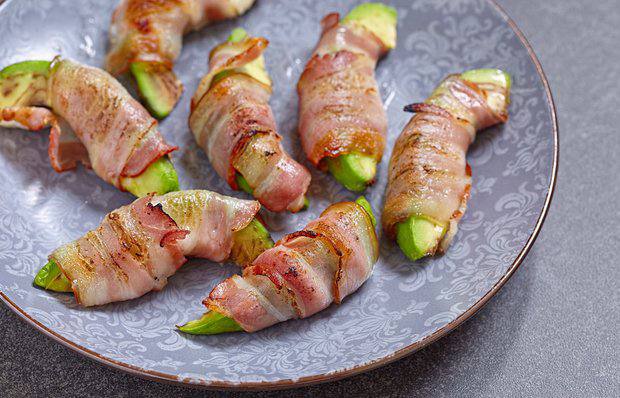 2․ Все кусочки авокадо по отдельности оберните беконом. Выложите на застеленный пергаментом противень.