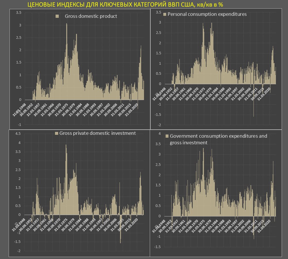 Последние отчетные данные лишают ФРС пространства для маневра по превентивным мерам смягчения ДКП ранее, чем инфляция вернется в целевые границы. Когда на уровне ценовых индексов ВВП фиксируется резкое ускорение инфляции в квартальном измерении – это фактически расширяет окно до полугода прежде, чем ФРС начнет действовать, т.е. в лучшем случае август-сентябрь.